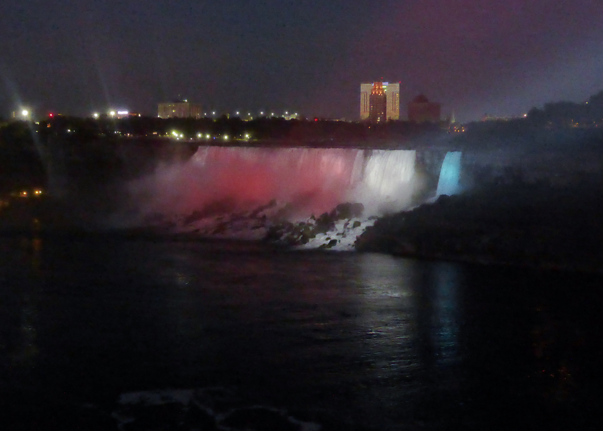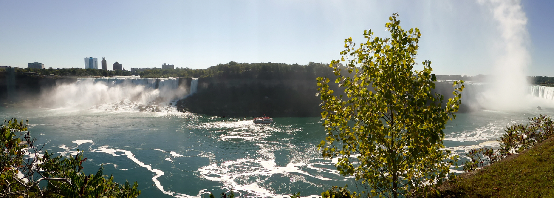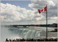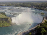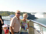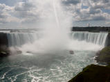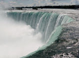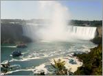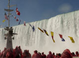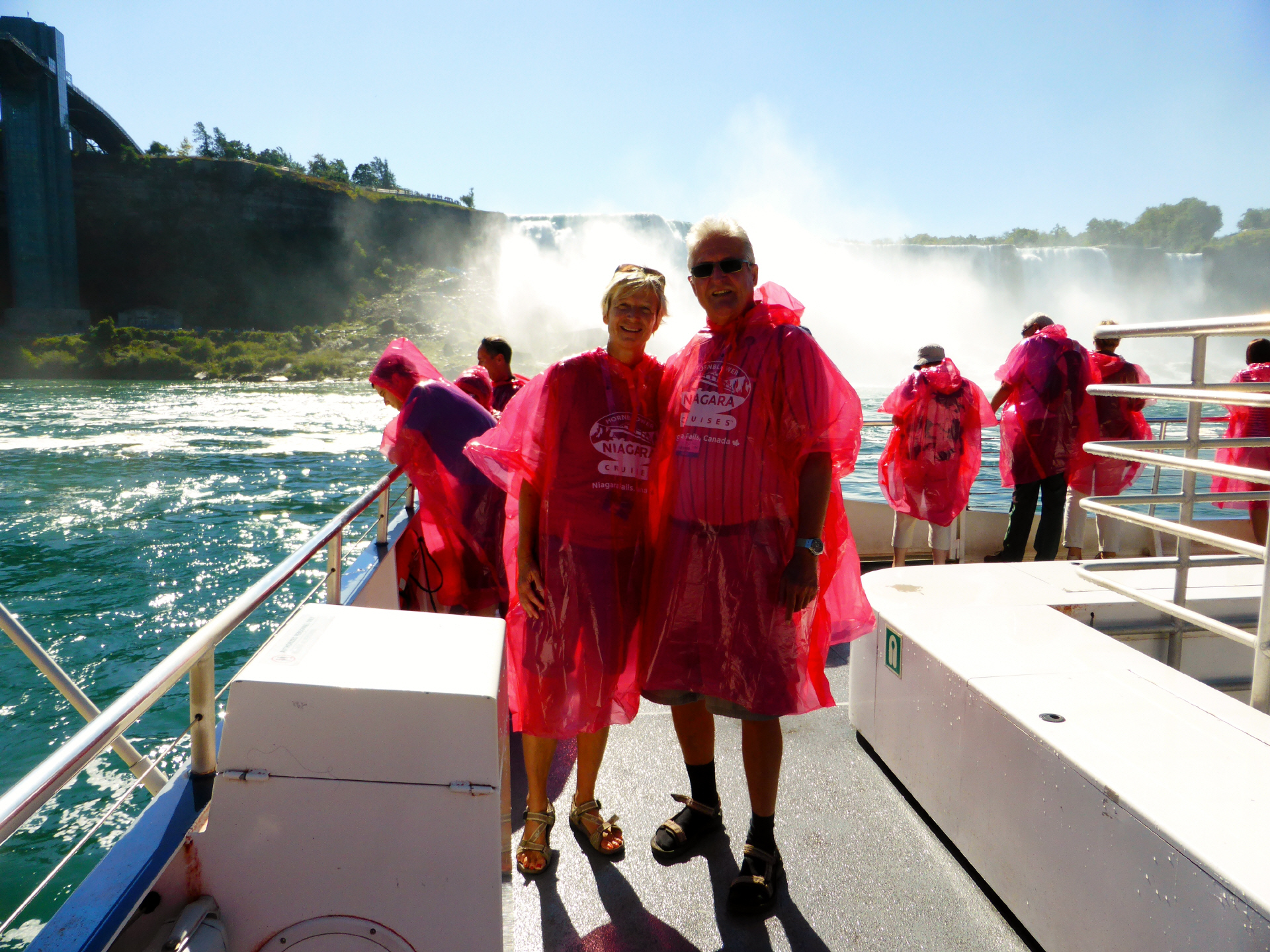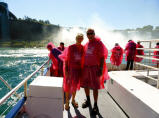 Die Horseshoe Fälle auf der kanadischen Seite sind 54 m hoch, die auf der amerikanischen Seite nur 34 m. 156 Mio. Liter Wasser stürzen pro Sekunde über die Kante. Zuerst mit dem Schiff ganz nah an beide Fälle. Jeder bekommt eine rote Pelerine. Eine nasse Angelegenheit, aber imposant.