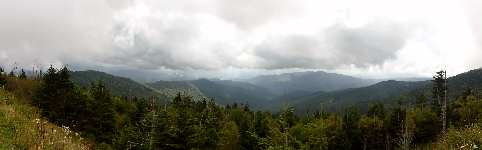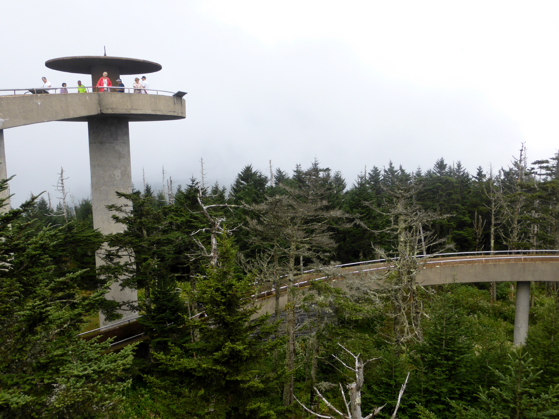 Great Smoky Mountain, wie es das Wort sagt: rauchende, blaue Berge. Das Wetter spielt nicht mit. Überall hängen tiefe Wolken und es regnet teilweise stark. Auf der Aussichtsplattform lauern wir auf freie Sicht.