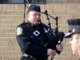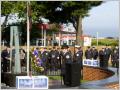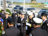Die ganze Feuerwehrbrigade steht stramm als die amerikanische Fahne aufgezogen und gleich wieder auf halbmast hinuntergelassen wird. Weisse Tauben werden in die Freiheit entlassen. Radio, diverse Fernsehsender, Journalisten und Fotografen sind hier. Der Feuerwehrpastor spricht inmitten des Strassenlärms ein Gebet. Der Dudelsackpfeifer dudelt und ein junger Feuerwehrmann spricht die Gedenkrede. Sehr eindrücklich und emotional. Kaspar erbettelt sich ein Feuerwehrabzeichen und bekommt zusätzlich eine Gedenkmünze.