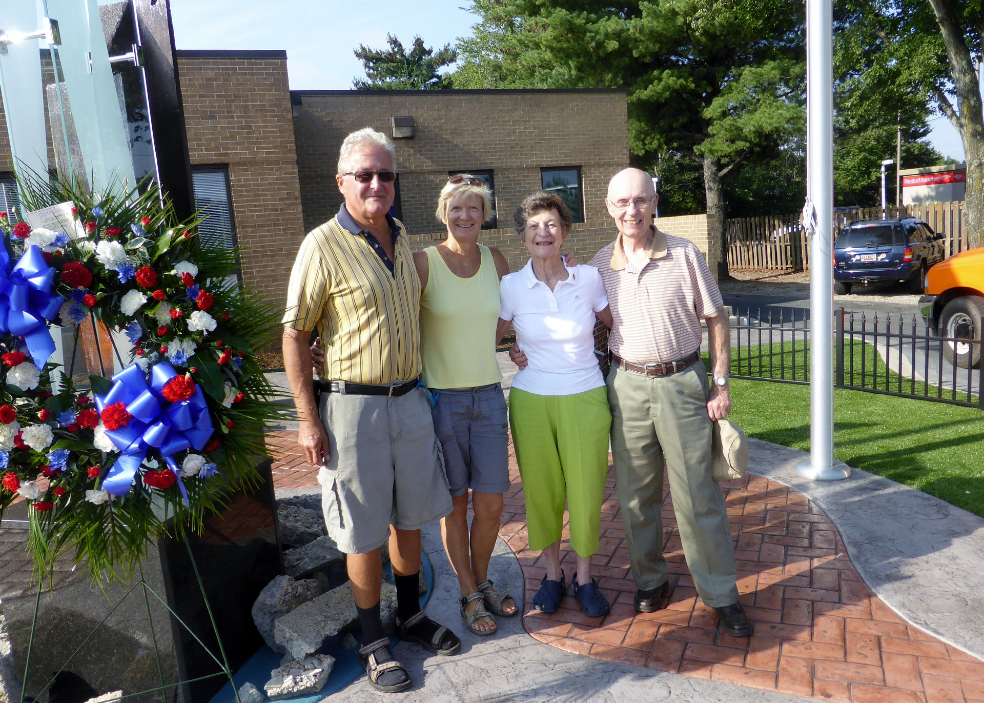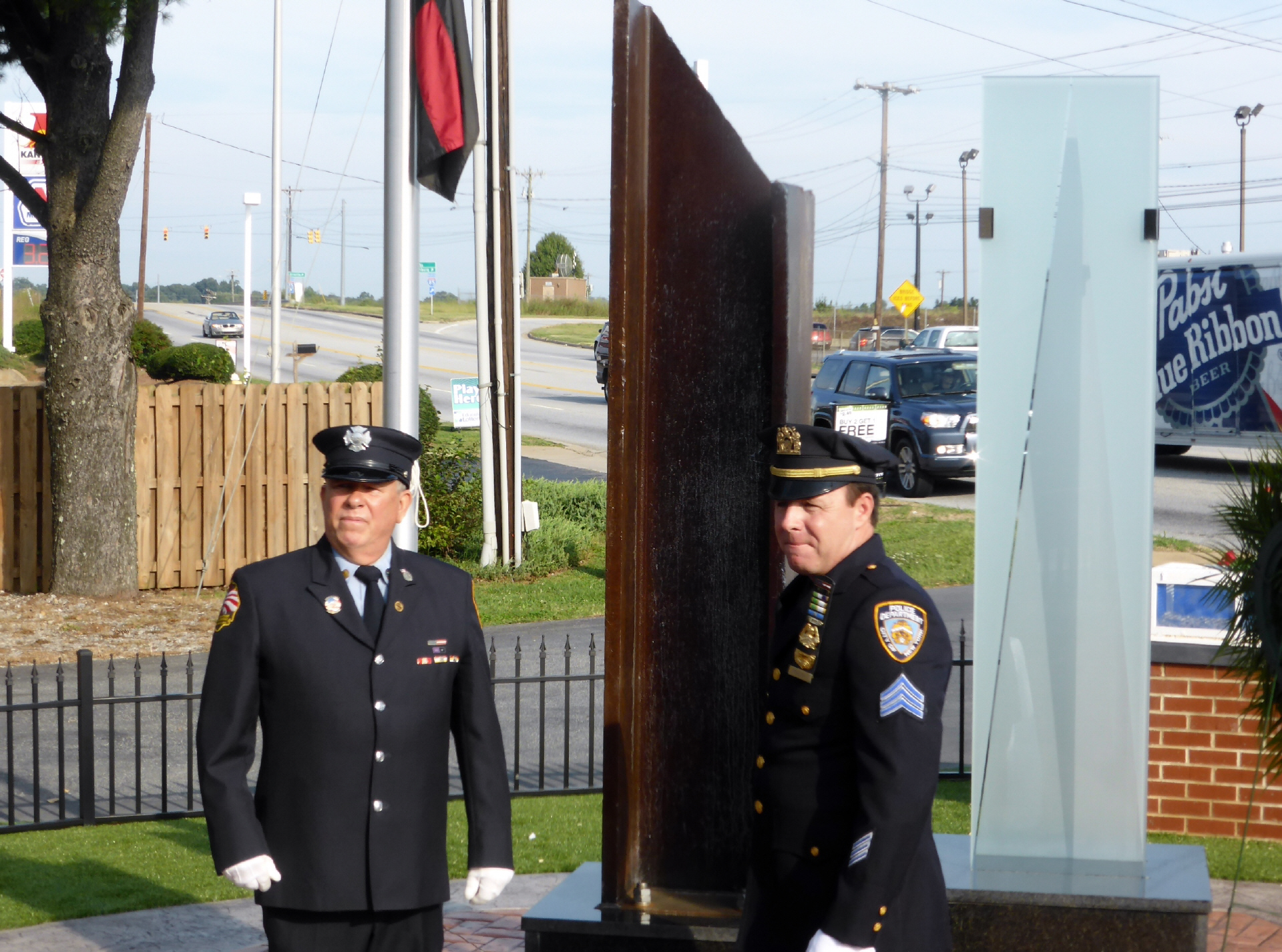 Wir besuchen Liz und Cliatt, die Eltern von Marianne in ‚Greer‘ Sie nehmen uns mit zur 9/11 ‘ Gedenkfeier‘ für den Terroranschlag im 2001. Es hat eine kleine Gedenkstädte vor dem Feuerwehrdepot von ‚Greenville‘. Ein Stahlträger der eingestürzten Zwillingstürme wird heute eingeweiht. Daneben steht eine Glasskulptur für den neuen Freedomtower in New York. Alles was Rang und Namen hat – auch wir zählen dazu – ist heute hier versammelt. Pensionierte und aktive Feuerwehrmänner sowie Polizeioffiziere aus New York.