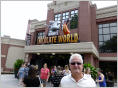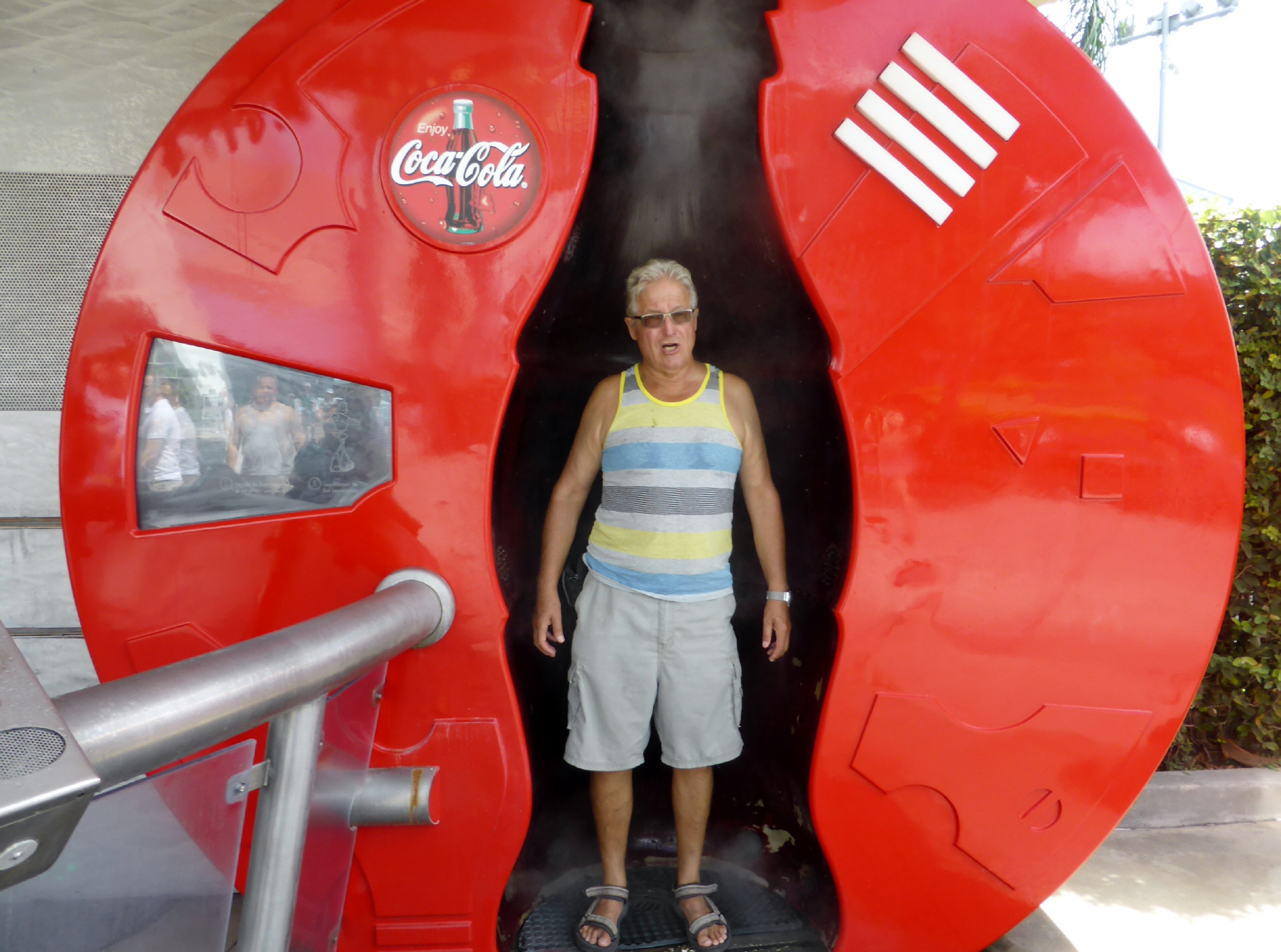 In der riesigen Cola-Flasche werden wir mit kaltem Wasser besprüht. Tut das gut! Schlendern durch die verschiedenen Filmstrassen der ‚alten Filme‘ und schauen der verrückten ‚Rockit Achterbahn‘ zu.