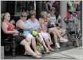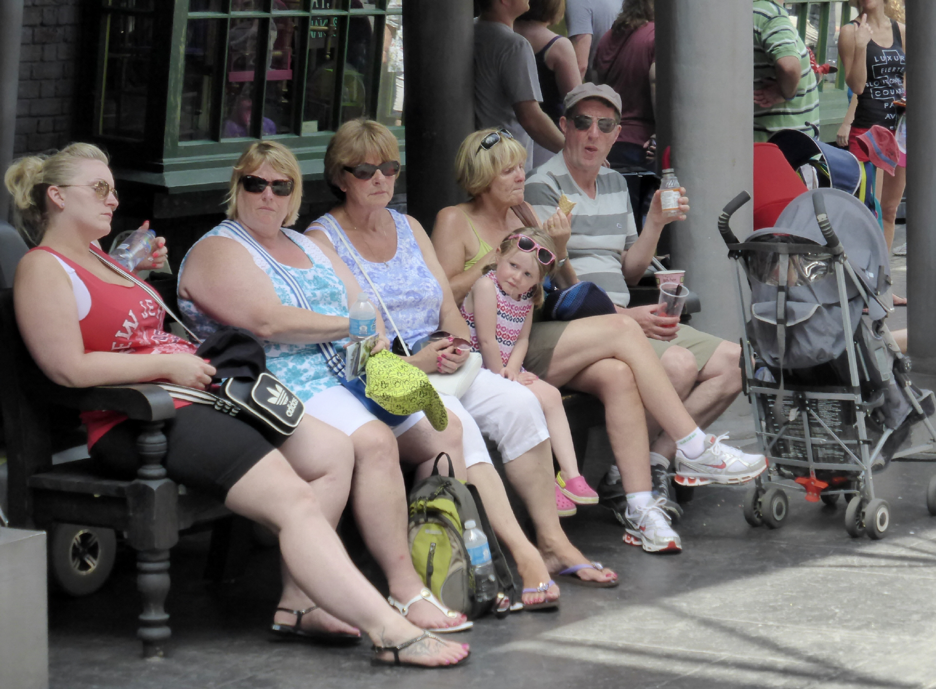 Von jetzt an sitzen wir mehr auf den Parkbänklis, keine Show mehr! In der ‚Harry Potter Dragon Allee’ mit den schiefen Häusern. Brauchen unbedingt etwas zu futtern und ein Cola, um den Magen umzukehren.