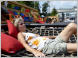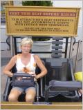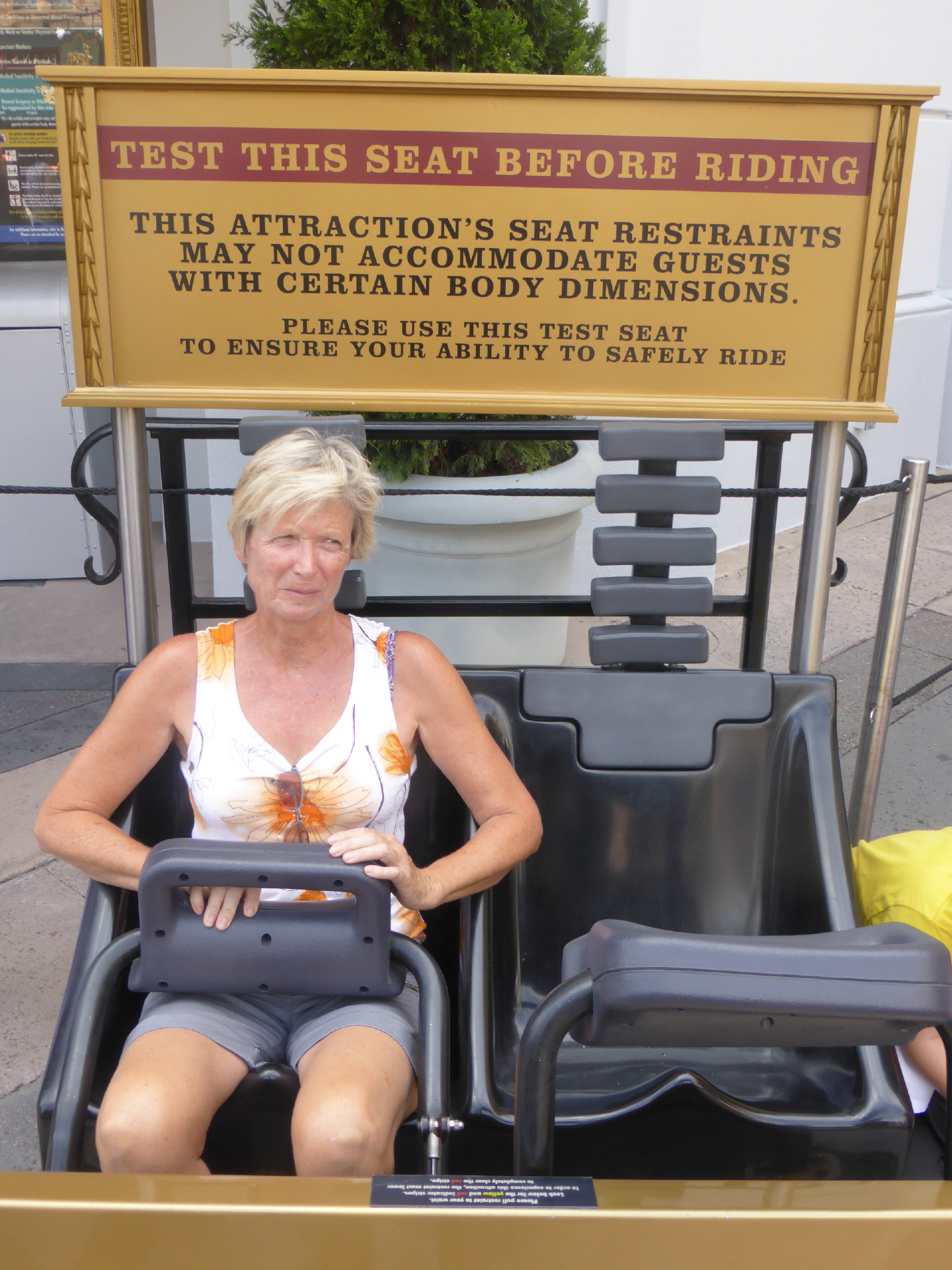 Bigi teste den Sitz für die Achterbahn. Eigentlich würde sie hineinpassen - viele Amerikaner jedoch nicht! Sie hat aber trotzdem KEINE Lust!