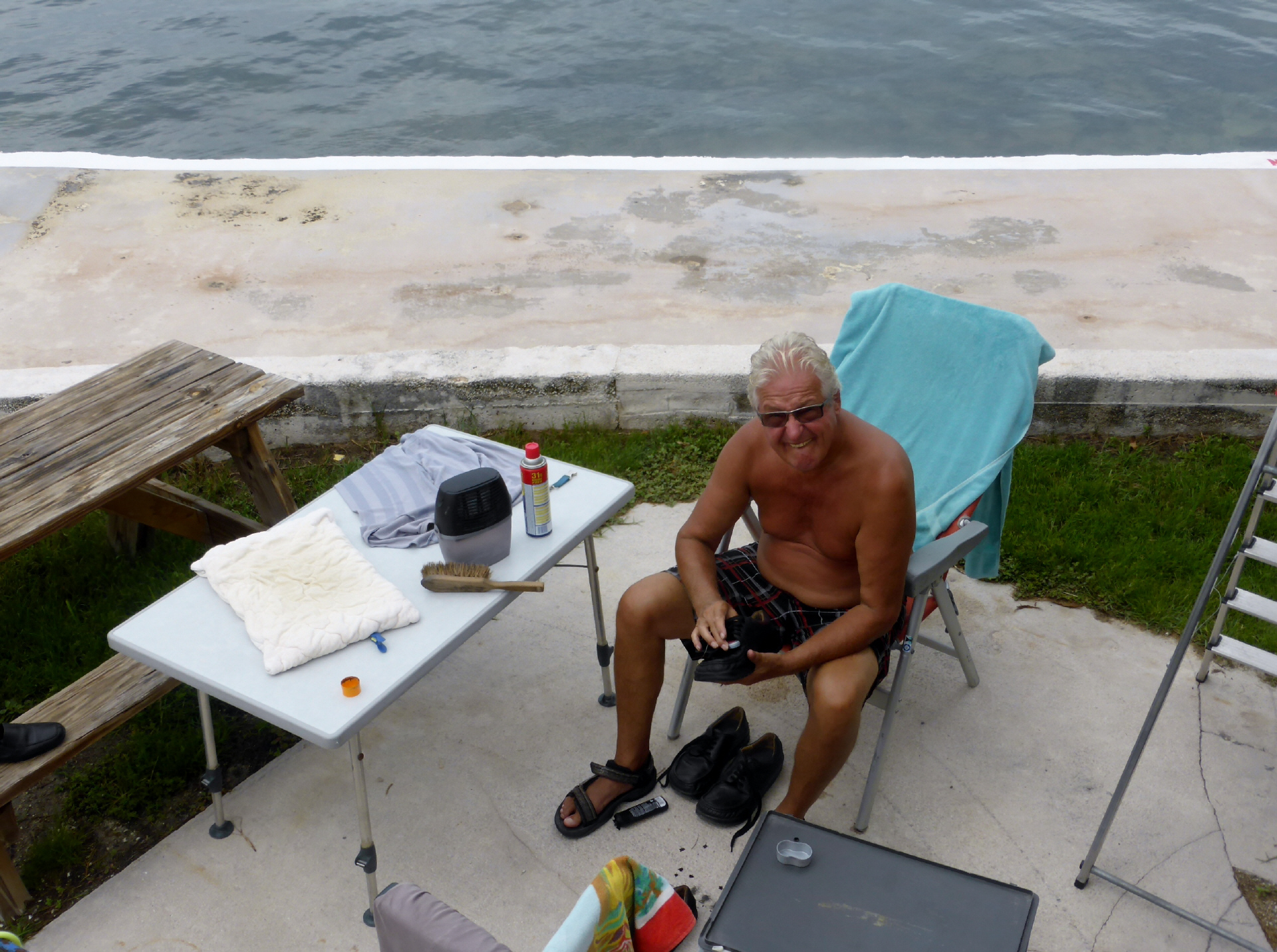 Die letzten Tage verbringen wir auf Long Key Island und Marathon Island. Diese zwei Inseln gehören zu den Upper Keys und sind auf halbem Weg nach ‚Key West‘. Die Seele baumeln lassen, schwitzen und warte, bis uns die Putzwut packt. Kaspar sortiert seine Socken: 14 Paar! Die schlechtere Hälfte wndert in die Kleidersammlung. Schuhe putzen für den Heimflug während Madame im Pool liegt.