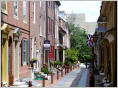 Betsy Ross schneiderte die erste amerikanische Flagge. Georg Washington kam zu ihr und hat ihr Anweisungen gegeben. Man sagt, dass sie eine kleine Änderung durchbrachte: statt 6-zackige Sterne 5-zackige, da diese einfacher zum Zuschneidern sind. Später war sie lange Zeit die ‚Union Jack Flaggen Herstellerin‘. Schlendern durch die ebenfalls in der ‚old City‘ gelegene, schmale, alte Gasse ‚Elfreth’s Alley‘.