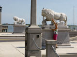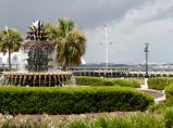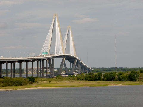In der Innenstadt gibt es viele, Parkplätze, aber leider nicht für unseren MAN. Fahren Richtung Aquarium und Cruise Terminal. Warum nicht den Polizisten um Rat fragen? Gleich einen Block weiter hinter dem Parkhaus für’s Aquarium gibt es Bus Parkplätze, das ist die einzige Möglichkeit für unser hohes Vehikel und erst noch gratis. Er schreibt uns Namen und Telefonnummer auf einen kleinen Zettel, falls wir Probleme bekommen. Das Schild ‚School Bus only‘ gilt für uns nicht. Bummeln die ‚Fashion Street‘ entlang. Viele Boutiquen bis zu den Hochpreismarken ‚Louis Vutton‘ und ähnlich. Gediegene Restaurants, wir begnügen uns mit einem belgischen Glacé. Auf dem City Market werden wunderschöne Bastkörbe, nicht ganz billig, verkauft. Sie werden von Schwarzen geflochten (ein Überbleibsel aus der Sklavenzeit). In vielen Läden degustieren wir kreuz und quer. Kaspar meint: ‚hier würd ich bestimmt nöd verhungere. Eifach gueti Kleider azieh und dur d’Läde streune und de Mage fülle‘.Fahren über die längste, 2005 eingeweihte, imposante Seilbrücke ‚Ravel Bridge‘ zum ‚Patriots Point‘.