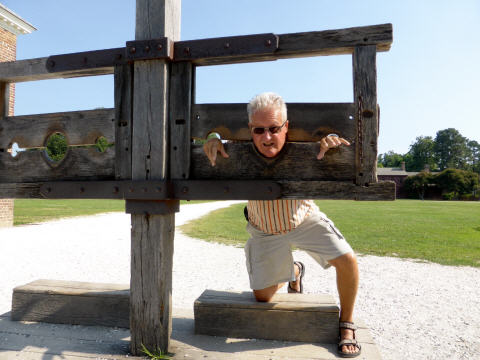 ‚Wiliamsburg‘ – Ballenberg von Amerika. Die ganze historische Stadt wurde renoviert, moderne Häuser abgebrochen und durch alte ersetzt. Vor den Häusern und Läden wehen englische Fahnen, denn die Stadt war Gouverneursitz der Engländer. Viele Amerikaner in alten Kleidern der damaligen Zeit zeigen das Handwerk: Schuhmacher, Bäcker, Schmied, Soldat und Gouverneur. Wir bummeln durch die breiten, für den Verkehr gesperrten Strassen, besuchen den Markt und diverse Läden. Sogar Bigi kann nicht viel mit der zum Verkauf angebotenen Ware anfangen. In einer Bäckerei erblicken wir Prussiens und kaufen zwei Stück. Schmecken sehr gut und gehen gleich nochmals zurück. Nun kaufen wir zum Schnäppchenpreis einen ganzen Sack voll Prussiens von gestern.