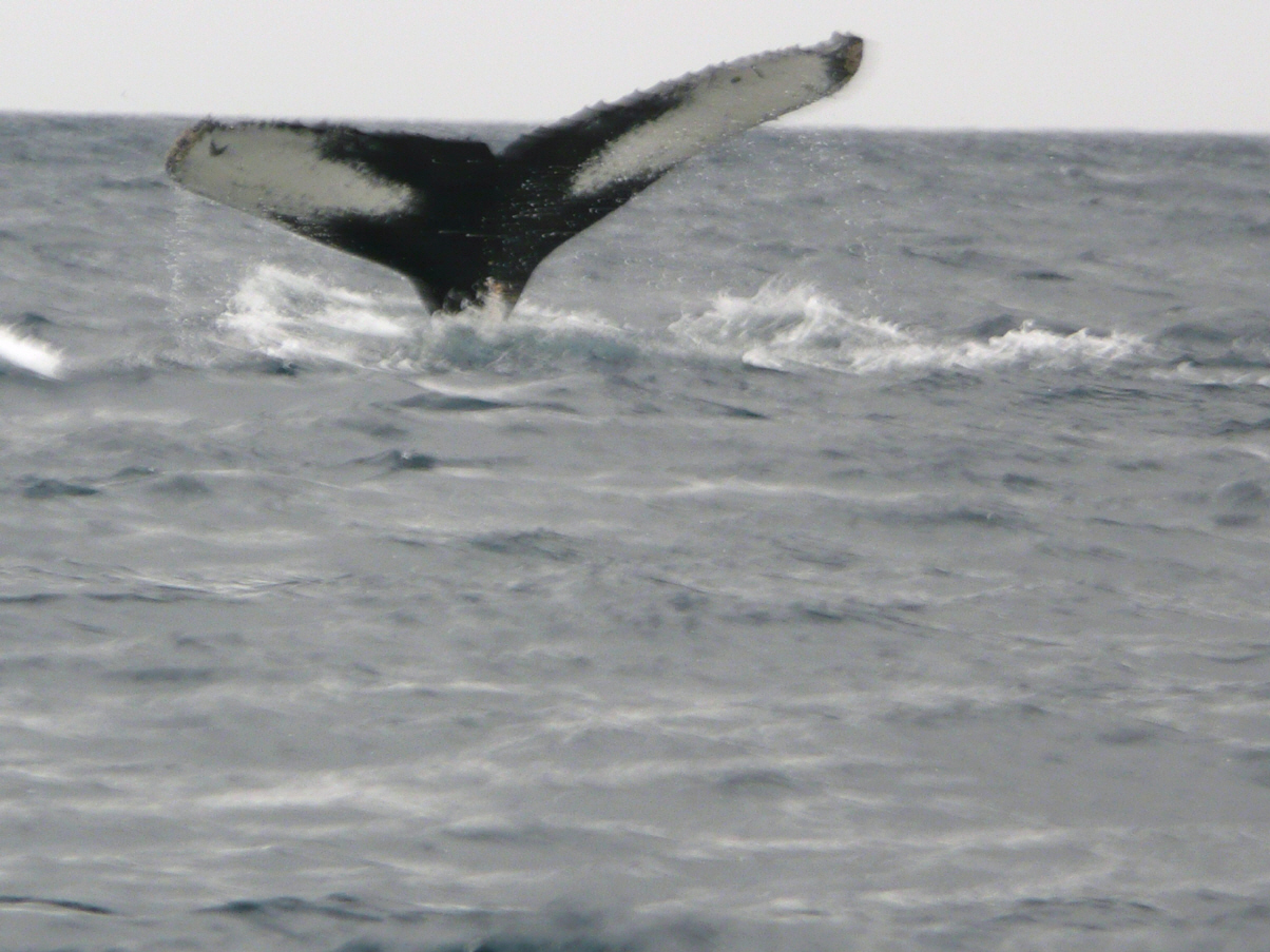 Um 19 Uhr werden in ca. 2 km Entfernung Wale gesichtet. Man sieht die Fontäne der Atmungsluft sehr deutlich. Alle rennen an die grossen Fenster des Speisesaals. Es bricht Hektik aus! Die erste Gruppe ist bereits in den Booten und wir Anderen warten sehnlichst auf die Tour. In der rauen See schlagen die Zodiac ganz fürchterlich auf die Wellen. Alle halten sich krampfhaft an den Seilen. Kaspars Rücken freut sich jedes Mal über die Schläge. Die ‚Chilbi‘ zu Hause ist kein Vergleich! Kommen bis 30 m an die Wale heran. Fotos der Finnen (Heckflosse) können geschossen werden. Auch Kaspar macht aus dem wackligen Boot ein paar unscharfe Bilder. Nachher geht es der schwarzen Küste entlang. Hier nisten viele Vogelarten. Die Wellen schlagen in die Buchten und kleine Eisschollen helfen beim Vordergrund der Fotos. Fahren in schnellem Tempo zurück bis jemand den Guide bittet, etwas langsamer zu fahren wegen der Schläge. Erst um 22.30 Uhr wird das Nachtessen serviert. Alle schwärmen von diesem sehr kalten Ausflug und zeigen ihre gelungenen Fotos herum!