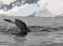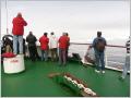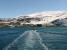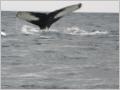Wir haben Glück! Wieder wurden Wale gesichert und in einer Sondertour (unsere Gruppe ist diesmal zuerst an der Reihe) fahren wir über das ruhige und sehr flache Meer. Weil es nicht windet, ist es heute gar nicht so kalt. Mit Vollspead brausen wir in die Nähe der Wale, welche wir durch die Luftfontäne leicht finden. Wir haben das Glück, dass wir mehrere sehr scharfe Bilder der Finne machen können. Dies ist gar nicht so einfach mit unserem kleinen Fotoapparat. Bis auf 5 m können wir an die Wale heranfahren. Meistens sind ist es ein Pärchen, aber einmal ist auch ein Jungwal dabei. Wenn die Wale ‚scheissen‘ stinkt es auch bei ihnen fürchterlich! Überhaupt ist es immer eine Lotterie, auf welcher Seite – hoffentlich nicht unter dem Zodiac - die riesigen Wale (15 - 20 m) wieder auftauchen. Alle sind happy!