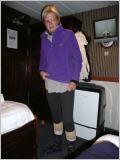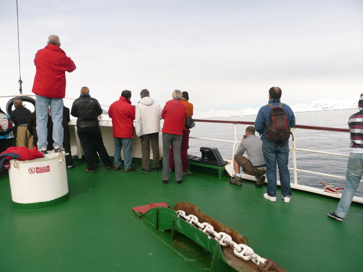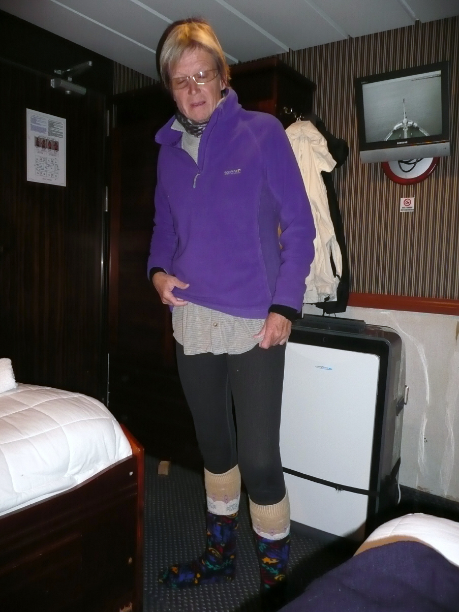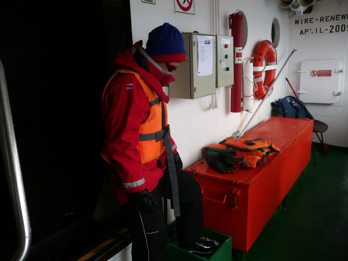 Liegend geht es Bigi gut, aber beim Morgenessen ist alles wieder vorbei. Am Mittag holt Kaspar für sie beim Schiffsarzt zwei stärkere Tabletten (Mareamin 100 mg). Die Pillen scheinen schnell zu wirken. Kaspar besucht wieder gute Vorträge über Pinguine und Seelöwen/Seeelefanten. Ein Tierfotograf, der auch als ‚Guide‘ arbeitet, erklärt wie ein Hobbyfotograf in der Antarktis gute Bilder schiessen kann. Die Lichtverhältnisse hier sind nämlich sehr speziell. Am späteren Nachmittag Anprobe der speziell warmen wind-/wasserfesten Jacken für die Landausflüge. Der Guide meint, es sei nicht allzu kalt, so zwischen +/- 5 Grad C. Der Wellengang ist moderat, aber das Treppensteigen und Gehen in den Gängen bereitet doch ziemlich Schwierigkeiten. Alle laufen ‚wie besoffen‘ herum und angeln sich von Pfeiler über Stangen zu den im Speisesaal am Boden befestigen Stühlen. Viele Passagiere lesen oder sitzen am Computer, sind faul oder liegen im Bett und schlafen. Kaspar hat Mühe bei diesem Seegang Tagebuch zu schreiben.