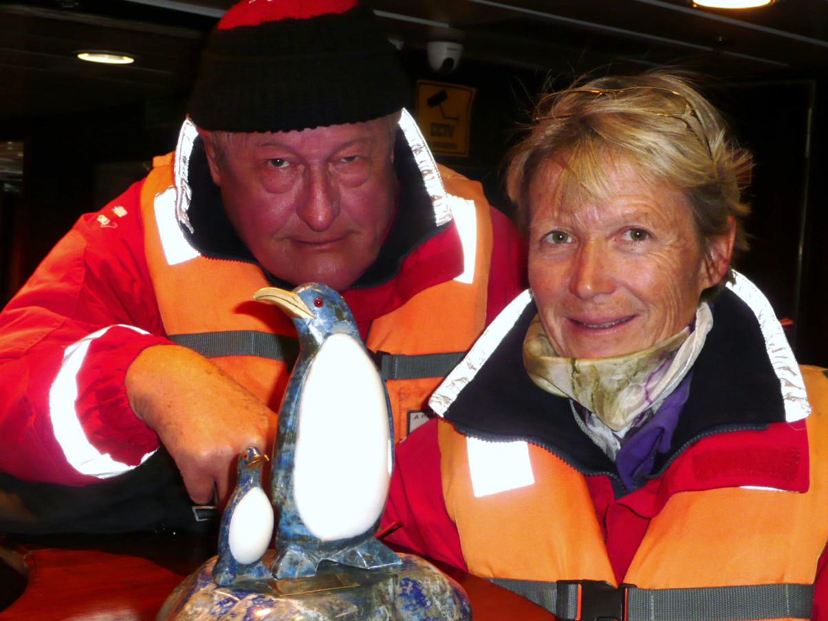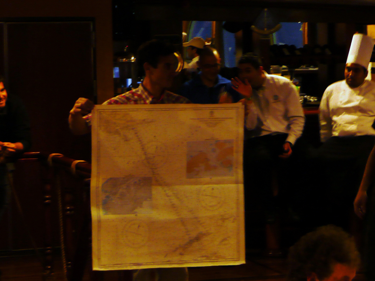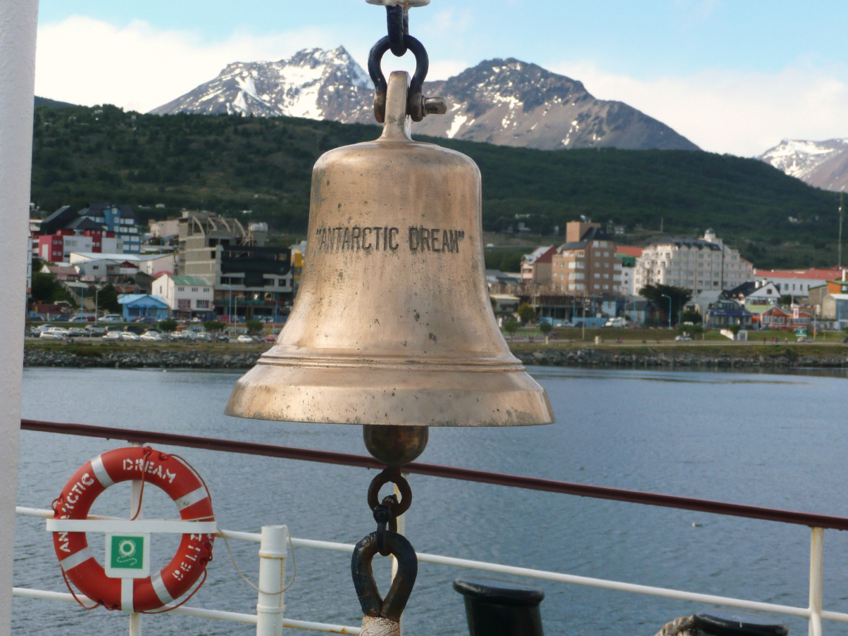 Die Guides haben eine musikalische Fotopräsentation der aktuellen Reise sowie ein illustriertes Tagebuch zusammengestellt. Alle Passagiere sind begeistert von den wunderschönen Bildern und der professionellen Aufmachung. Die meisten Passagiere laden dies auf einen USB-Stick. Überhaupt sind hier die meisten Passagiere mit vielem elektronischen Zubehör ausgerüstet: Laptop, spezielle Kameras, iPod, Kopfhörer, E-Books und vieles mehr. Die Passagiere haben die verschiedensten Berufe: Pensionierte wie wir, Drogist, mehrere Fotografen, ein Dokumentarfilmer mit Partnerin, Journalisten, Heissluftpilot, Banker, Hörakustikerin und Studenten. Sie kommen aus folgenden Ländern: Chile, USA, Frankreich, Portugal, Spanien, Brasilien, Deutschland, Holland, England, Kanada, Thailand, Israel, Japan, Italien und wir zwei Schweizer. Bordsprache vorwiegend Englisch und Spanisch. Natürlich darf der Farewell-Cocktail sowie wieder ein hervorragendes Gourmetmenu nicht fehlen. Die Passagiere sind am Geniessen, denn die See hat sich beruhigt und die berühmt berüchtigte Drake Passage ist Vergangenheit. Um in den Beagle Kanal einfahren zu können muss der Kapitän bis morgens 3 Uhr auf den Lotsen warten. Am Ende des Abends gibt es eine Versteigerung zu Gunsten der Crew-Kasse. Der Dreiecks-Wimpel ‚Antarctic Dream‘ geht für $ 200 nach Spanien. Die Antarktik-Schiffskarte (1x1 m), mit allen Kursänderungen minutiös von Hand eingezeichnet und vom Kapitän signiert, ersteigert sich Kaspar nach einem heissen Bietgefecht für $ 300. Er strahlt und wird von vielen beglückwünscht. Die eingerahmte Karte bekommt zu Hause einen Ehrenplatz!
