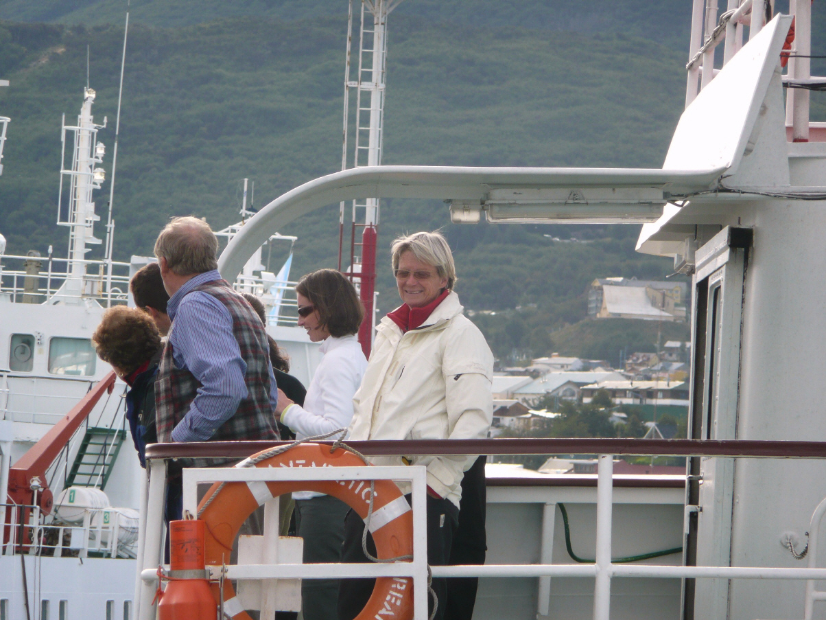 Kaspar hatte eine Horrornacht: das gestrige Rindsfilet war zu viel des Guten! Tagwache 06.30 Uhr! Wir packen unsere ‚sieben Sachen‘ (siebzig Sachen) und besuchen fürs letzte Fotoshooting die Kapitänsbrücke. Die Crew bringt die schweren Gepäckstücke nach oben. Nach dem Frühstück verabschieden wir uns von den andern Passagieren. Es haben sich einige Freundschaften und Liebeleien ergeben. Wir als Schweizer sind halt etwas trocken – ist dies etwa wegen der Sprachbarriere?! Mit dem Taxi zum Campingplatz. Der Motor des MAN springt sofort an und wir parkieren auf einer geraden Fläche, um unsere siebzig Sachen wieder im MAN zu verstauen. Nachher fahren wir nach Ushuaia hinunter um die Wäsche beim Waschsalon abzugeben und die Mietklamotten zu retournieren. Bummeln durch die Einkaufsstrasse. Kaspar kauft sich doch noch eine warme, doppelseitige schwarz-weisse Fleecemütze mit Ushuaiasignet. Bigi erhält eine weisse ‚Patagonien‘-Fleecejacke (die Dritte auf dieser Reise). Im Restaurant ‚El Turco‘, in welchem unsere Tour-Guides essen, lädt Bigi die Präsentationen auf den USB-Stick. Christine, die uns sehr sympathisch war, hat heute Geburtstag und wir überreichen ihr ein kleines Schweizer Präsent (Waschlappen mit Kuh und Edelweiss, Kugelschreiber mit Schweizer Kreuz und natürlich Schweizer Schokolade). Auch die andern Guides erhalten ein kleines Präsent von uns. Nachher geht Kaspar zum Coiffeur und lässt sich die Haare kurz schneiden – entpuppt sich als sehr kurz und er braucht den nächsten Termin erst wieder in 4 Monaten! Treffen noch ein St. Galler Ehepaar, welches mit Hund auch in einem MAN unterwegs ist. Wegen des Hundes können die Beiden jedoch keine Antarktistour unternehmen und keinen Nationalpark besuchen.