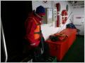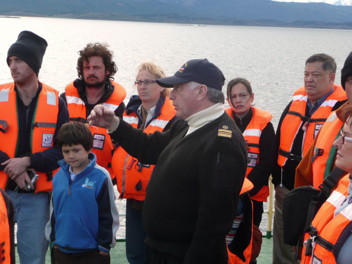 Eine halbe Stunde später ertönt das Signal ‚Seenotübung‘ (Punkt Punkt Punkt Punkt Punkt Strich). Wir holen die Schwimmwesten und üben die korrekte Handhabung derselben. Anschliessend aufs Deck, wo wir die Zuteilung zu den Rettungsbooten erhalten. Lockere Stimmung, aber trotzdem möchte wahrscheinlich niemand bei diesen kalten Wassertemperaturen in Seenot geraten. Gerüchtemässig hören wir, dass ein am 5. Dezember ausgelaufenes Schiff in der Drake Passage in Seenot geraten ist!? Danach gibt’s den Empfangs-Cocktail: Empanadas, Crevetten- u. Pouletspiessli sowie diverse Häppchen und Drinks. Die ‚Antarctic Dream‘ legt ab.