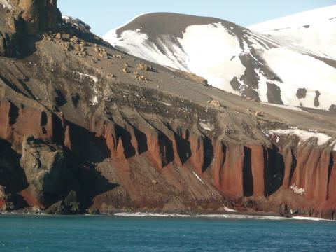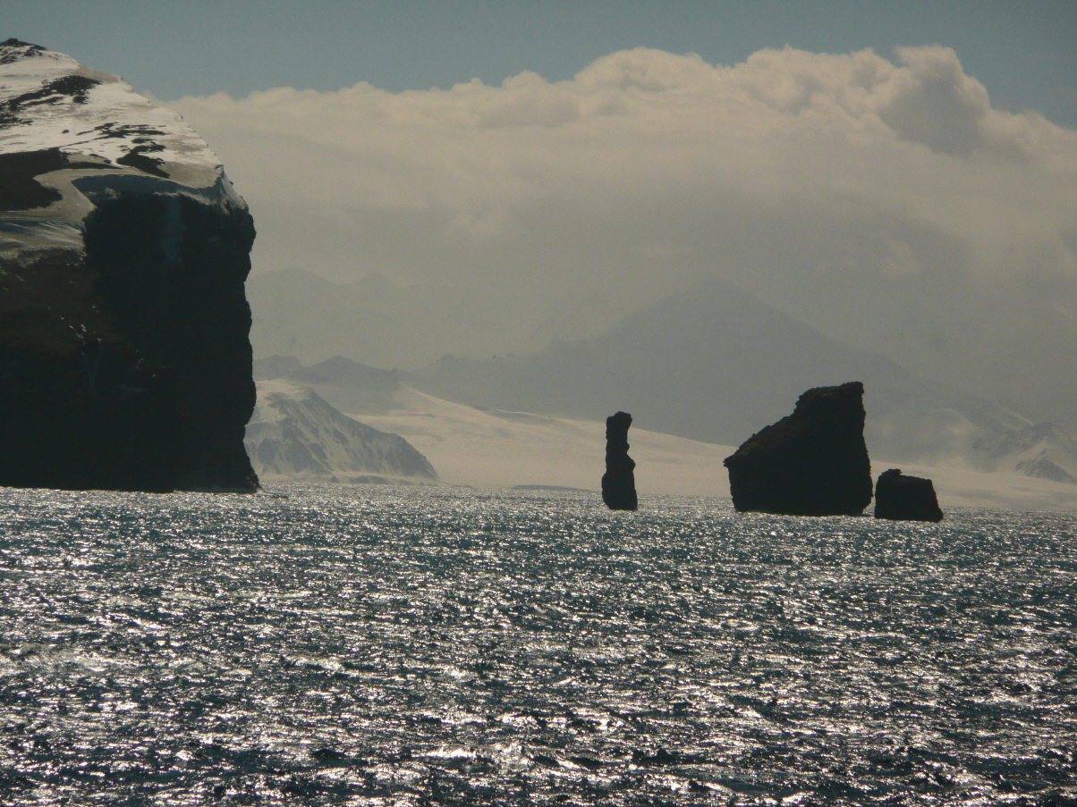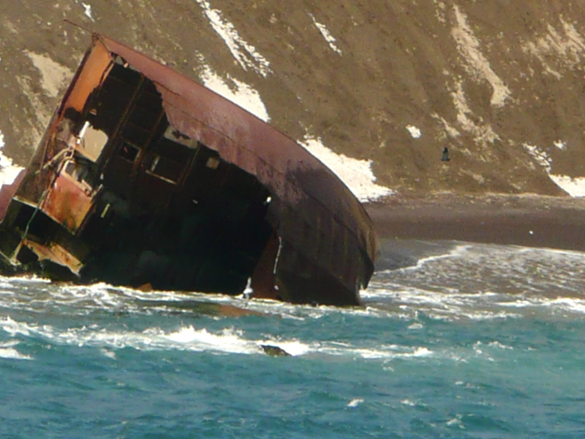 Wecken um 7 Uhr. Sofort greift Kaspar zum Fotoapparat und wir eilen auf die Brücke. Schlaftrunken oben angekommen, das erste Foto schiessen. Oh Schreck, die Batterie ist noch im Ladegerät. Also vier Stockwerke über steile Treppen runter in die Kabine. Verpassen deshalb fast die schmale, nur hundert Meter breite Einfahrt in die Vulkanbucht. In der Einfahrt liegt ein britisches Schiffswrack, welches die Durchfahrt nicht geschafft hat. Nun befinden wir uns in einem ‚grossen, geschützten Hafen‘. Die Briten unterhielten von 1944 - 1946 hier einen U-Boothafen. Danach war es eine norwegische Walfangstation.