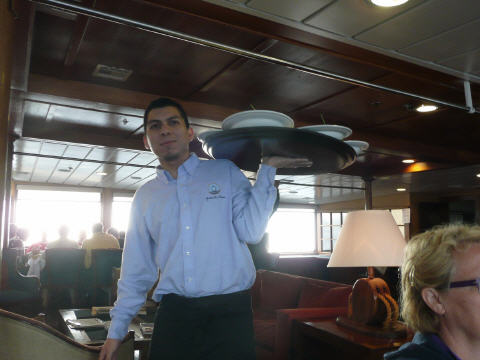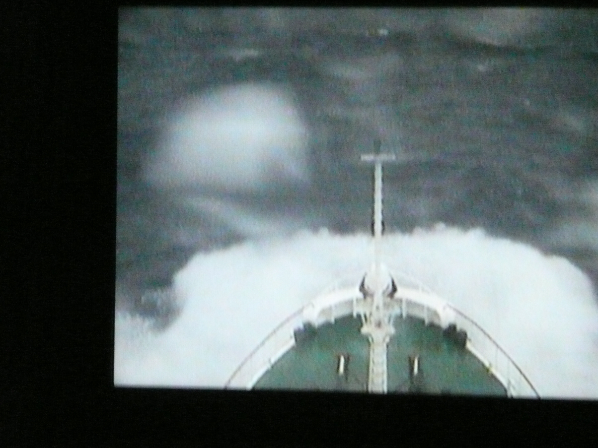 In der Nacht hat es stark geschaukelt und immer wieder laut Wellen an die Schiffswand geschlagen. Kleider fallen vom Tisch und an Schlaf ist teilweise nicht zu denken. Das Bett federt unter dem Körpergewicht und macht die Schaukelbewegung des Schiffes in alle Richtungen verzögert mit. Liegend, vom Bett aus, können wir dank Kamera am Schiffsmasten alles live verfolgen und uns auf jede neue Welle vorbereiten. Mit den neuen Seekrankheitspillen geht es Bigi diesmal erstaunlich gut. Wir können frühstücken: Rührei, Speck, Schinken, Käse, Brot, Butter, Konfitüre, Joghurt, Früchte, Kuchen, Kaffee und Tee. Zu unterst im Schiff gibt es einen grossen Vorführsaal für Vorträge und Filmvorführungen. Heute gibt’s einen Vortrag über einen schwed. Antarktisforscher aus dem Jahre 1905-1907. Kaspar hat nur die Hälfte des Vortrages mitbekommen. Das Schaukeln und monotone Schiffsgeräusch im Hintergrund sind einschläfernd. Am Nachmittag dann ein Vortrag über die Verschiedenheit der Pole, Antarktis und Arktis. In der Arktis ist alles Wasser und die Antarktis ist ein Kontinent. Die Tierwelt ist ebenfalls unterschiedlich. In der Antarktis gibt es Pinguine, jedoch keine Eisbären. P.s: Königspinguine gibt es nur auf den Falklandinseln und St. Georg Island und so sehen wir leider keine. Es ist immer noch schwerer Seegang, 7 – 8 m hohe Wellen. Die Tische sind mit Rutschmatten bedeckt. Wein wird in Wassergläsern serviert. Das Essen ist meistens an den Tellern ‚angeklebt‘, z. B. mit Kartoffelstock oder sonstigen Breis. Auch gibt es nie Sauce und auch Reis oder Erbsli war noch nie auf dem Menu. Ausser in der Drake Passage gibt’s übrigens zweimal täglich Dessert-Buffet!