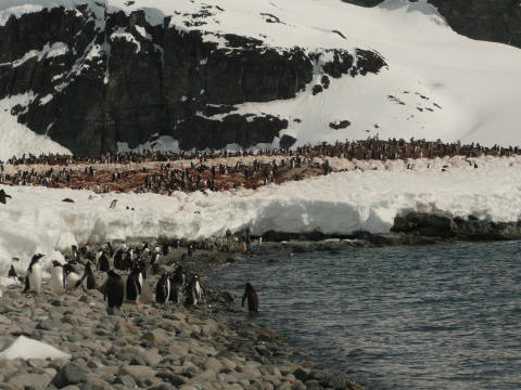 Die nächste Tour beginnt bereits um 11 Uhr und bringt uns an Land zu tausenden von Pinguinen. Es stinkt stark, liegt doch viel Kot herum. Wir watscheln ähnlich den Pinguinen in Einerkolonne in der Spur, um keine grossen Löcher zu treten, da sonst die Pinguine leicht hereinfallen könnten. Diese gehen immer auf den ‚Pinguine-Highways‘. Besteigen einen Hügel. Sehr schwieriger Schnee und man versinkt zum Teil bis zu den Knien. Danach recht geschafft legen wir uns in den Schnee und betrachten das imposante Panorama mit den Bergen, Gletschern und Pinguinen. Der Abstieg gestaltet sich etwas einfacher: alt und jung rutschen auf dem Hosenboden in grossem Tempo den Hügel hinunter - nasse Kleider vorprogrammiert. Auf dem Schiff wieder Desinfektion der Stiefel, Batterie des Fotoapparats aufladen und einen neuen Fotochip einlegen.