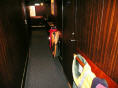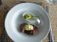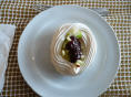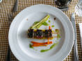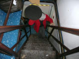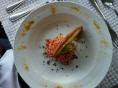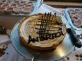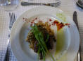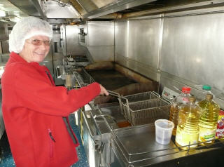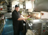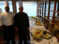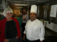 Können die Küche besichtigen. Aus hygienischen Gründen müssen wir Haarnetze aufsetzen. Auf engstem Raum arbeiten hier 3 Köche, Konditor und Bäcker und bringen köstliche Menus und Torten auf die Tische. Vor allem der steile Auf-/Abgang hat es in sich, balancieren die Kellner hier doch bis zu 8 Tellern auf einem Tablett.