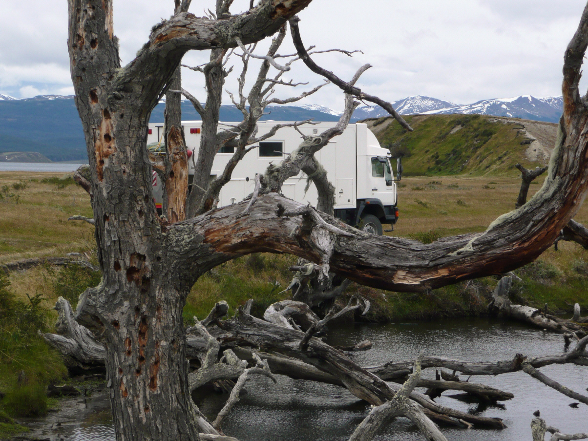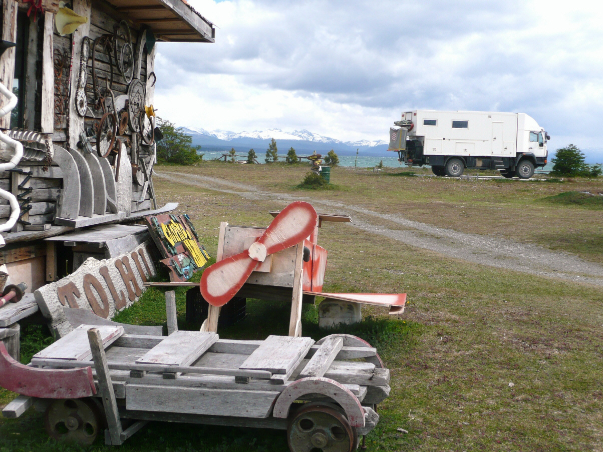 Von hier aus fahren wir wieder Richtung Route 3, dann über den Pass Garibaldi Richtung Tolhuin (Norden). Auf der Passhöhe verkauft ein Argentinier Holzsouvenirs und wir kaufen 3 kleine Pinguine. Den Pass hinunter und auf einer schlechten Erdstrasse an den Lago Fagnano. Am Ende der Strasse, nach 25 km, treffen wir wieder auf Thomas und Regina mit Hund Nura und MAN. Trinken zusammen Kaffee und tauschen Reginas Hefestollen gegen Bigis Schoggi-Chips.