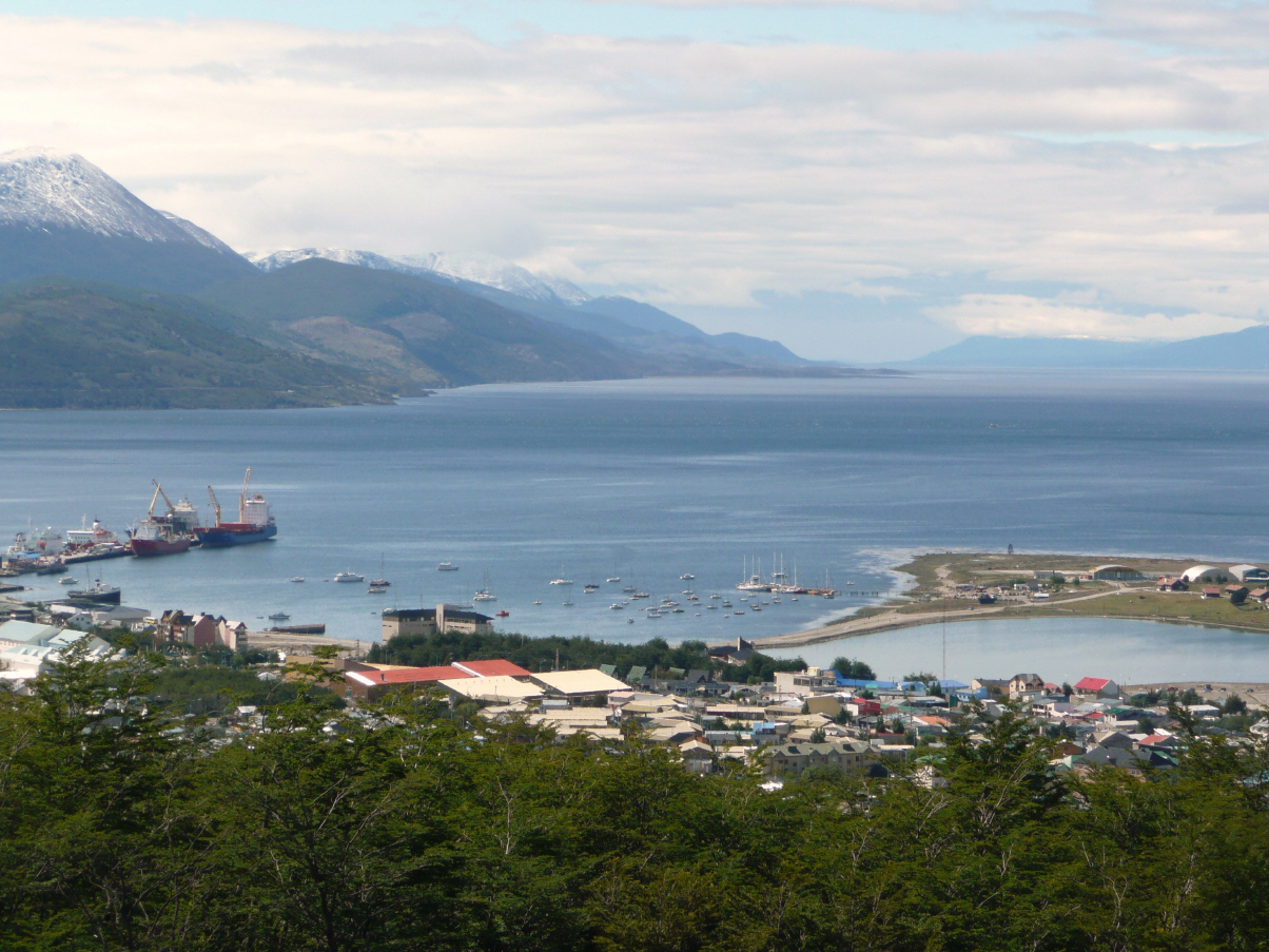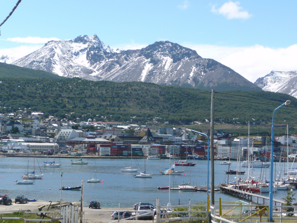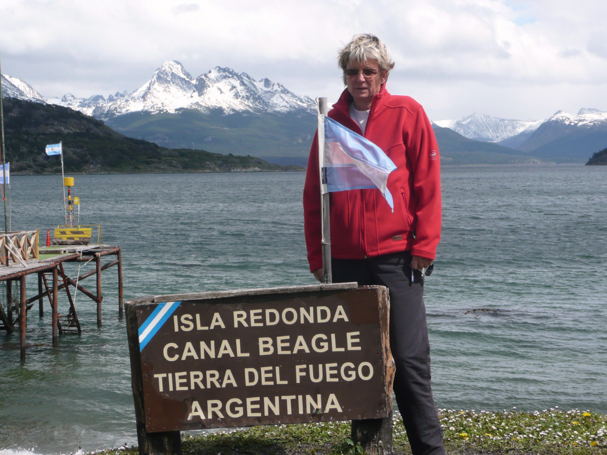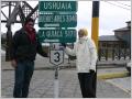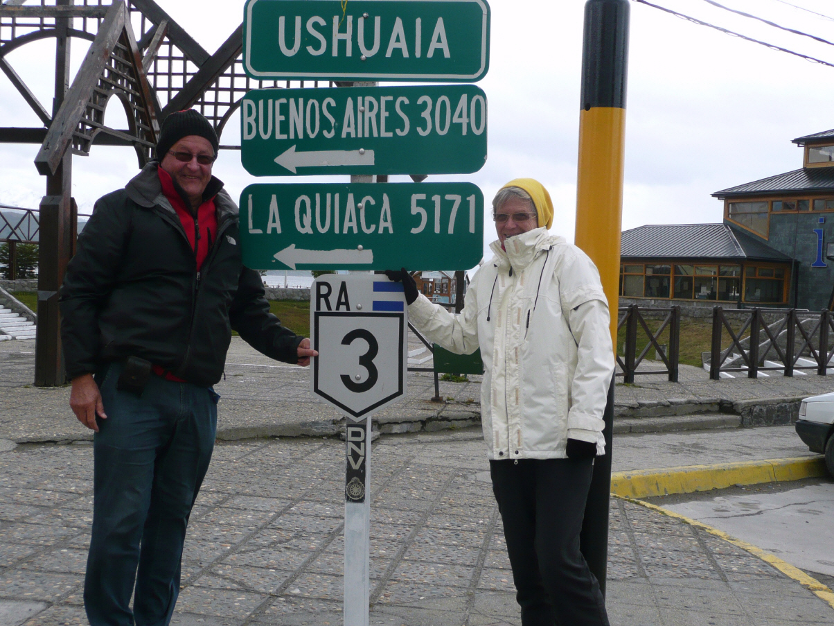 Tanken Wasser und machen dabei Bekanntschaft mit einer in einem 4x4 Toyota alleinreisenden älteren Italienerin. Wir haben sie schon ein paarmal auf der Tour gesehen, aber nie mit ihr gesprochen. Dem Lago Fagnano entlang durch Wälder und über einen kleinen Pass bis ‚al Fin del Mundo‘ (Ende der Welt), Ushuaia. Eine kleine Stadt mit ca. 65‘000 Einwohnern, sehr touristisch mit vielen Outdoor- und Souvenirläden sowie Restaurants. An einem Pier liegen zwei Containerschiffe und es legen hier auch die Antarktis-Kreuzfahrtschiffe an. In einem Reisebüro klären wir die Möglichkeit für eine 11-tägige Schiffsreise in die Antarktis ab. Es hat in den nächsten Tagen zwei Schiffe mit freien Plätzen. Machen eine prov. Reservation. Zur Sicherheit checken wir bei zwei anderen Reisebüros die Preise ab. Alle Preise sind gleich, nichts da mit ‚last minute‘. Nun ist alles klar und wir gehen zum ersten Reisebüro zurück und buchen definitiv. Bigi kauft sich eine warme Kappe sowie ein Stirnband mit Pinguinen.