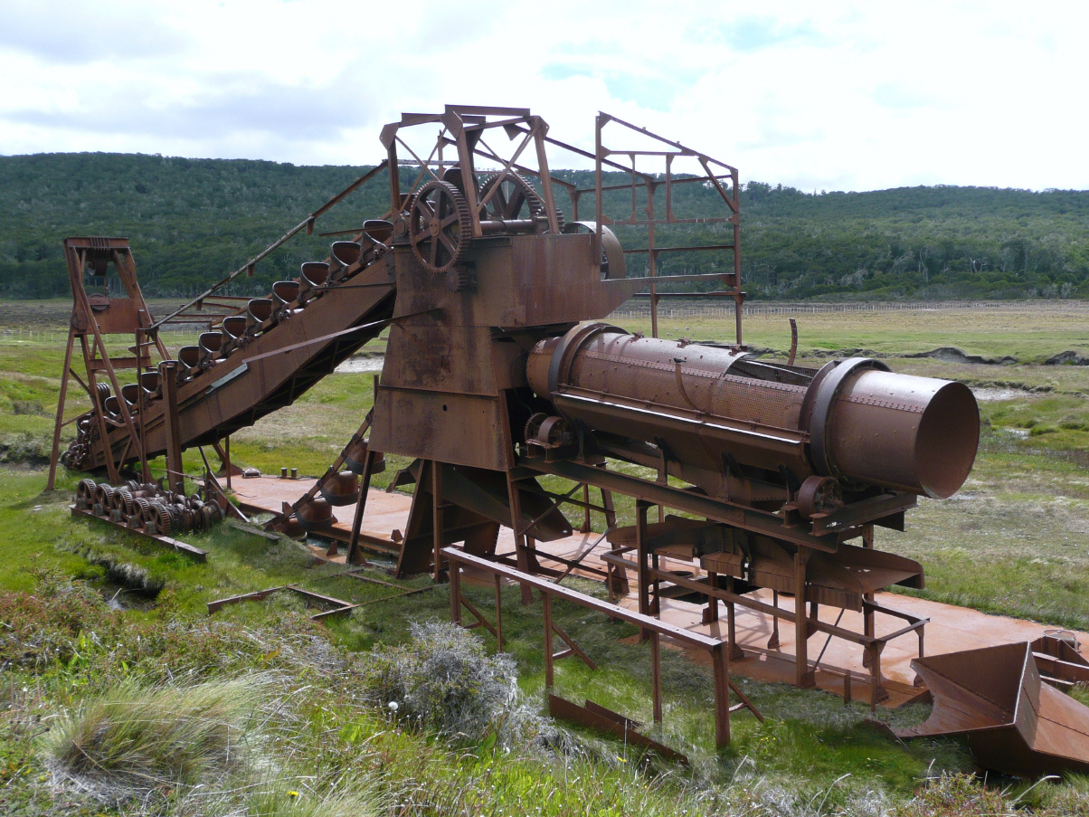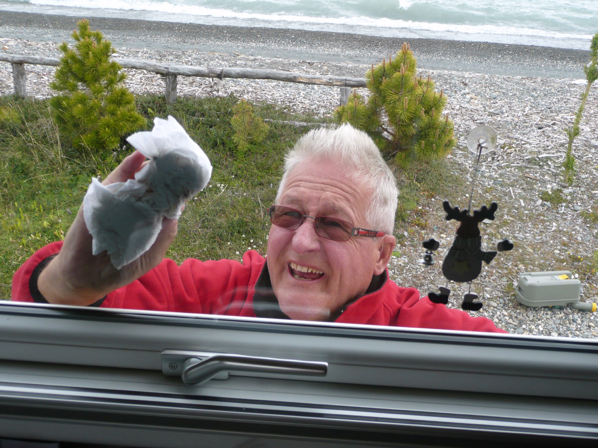 Es wird spät und auf dem dunkle Heimweg, ca. 50 m, sehen wir Sterne. Zwei Minuten im Camper und schon beginnt es fürchterlich zu regnen. Die ganze Nacht schüttelt und rüttelt es. Fahren zurück und bei der gestrigen Schlitteltour suchen und finden wir das zerbrochene Rücklicht. Werden es bei Gelegenheit zusammen leimen. Aber es sollte nicht soooo kalt und windig sein. Richtung ‚Cameron‘. Auf halbem Weg steht verlassen ein Goldschürf Bagger aus dem Jahre 1907 -1910. Der Goldrausch war kurz und nicht kostendeckend. Cameron, Ansammlung Häuser mit Strassenbeleuchtung, liegt in einer Senke, recht gut geschützt vom Wind. Wollen noch etwas weiter gegen Süden, aber nach 10 km schlechter Strasse beschliessen wir zurück zu fahren. Jetzt stehen wir auf einer Anhöhe über dem Meer ‚Bahia Inutil‘ (unnütze Bucht, denn die Segelschiffe auf der Suche nach der Passage in den pazifischen Ozean mussten alle Buchten abfahren). Bigi kann Kaspar doch noch zu einem kurzen Spaziergang bei starkem Wind in der Pampas überreden. Kaspar holt zum Abendessen eine gute Flasche Franzosen ‚St. Emillion‘ aus dem Keller. Leider mit wenig Zapfen – aber was soll es, den Wein kann man hier in der Pampas nirgendwo retournieren. Die Sonne scheint ab und zu durch das Fenster.