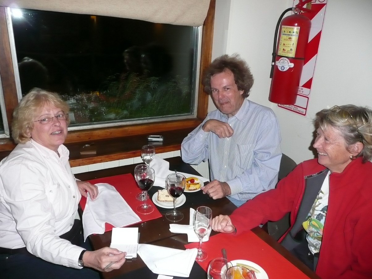 Das Weihnachtsessen im Hotel Kaiken soll irgendwann zwischen 20.30 und 21.00 Uhr starten. Bigi möchte schon früh dort sein, aber Kaspar will nicht immer der Erste sein und dann lange warten. Also marschieren wir um 20.15 Uhr los und sind Punkt 9 Uhr dort. Ausser einem netten Holländer Ehepaar ist noch niemand anwesend. Die Argentinier, welche nach und nach eintrudeln, sind herausgeputzt. Die Frauen tragen schulterfreie Kleider und stehen auf hohen Schuhabsätzen. Um 21.30 Uhr geht es dann los mit Wein und Häppchen. Um 22.15 Uhr werden alle zu Tisch gebeten. Wir setzen uns an den gleichen Tisch wie Jos und Loes aus Holland. Wir haben ein lustiges und gutes Gespräch. Jos war eine Bibliothekarin in gehobener Anstellung an der Universität in Utrecht und Loes oberster Koordinator für die Utrechter Stadtentwicklung. Sein Budget in 5 Jahren: 200 Mio. Euro! Das 3-Gang-Wahlmenu ist super, dazu trinken wir Wein ‚Fin del Mundo‘ und zum Schluss kommt nochmals ein Dessertbuffet. Um Mitternacht stossen alle Gäste mit Sekt an. Ende des Abends 01.15 Uhr! Danach geht’s zu Fuss 45 Minuten im Mondschein dem See entlang nach Hause – ein schöner Abschluss des Weihnachtsabends. Um 02 Uhr sinken wir kaoh ins Bett.