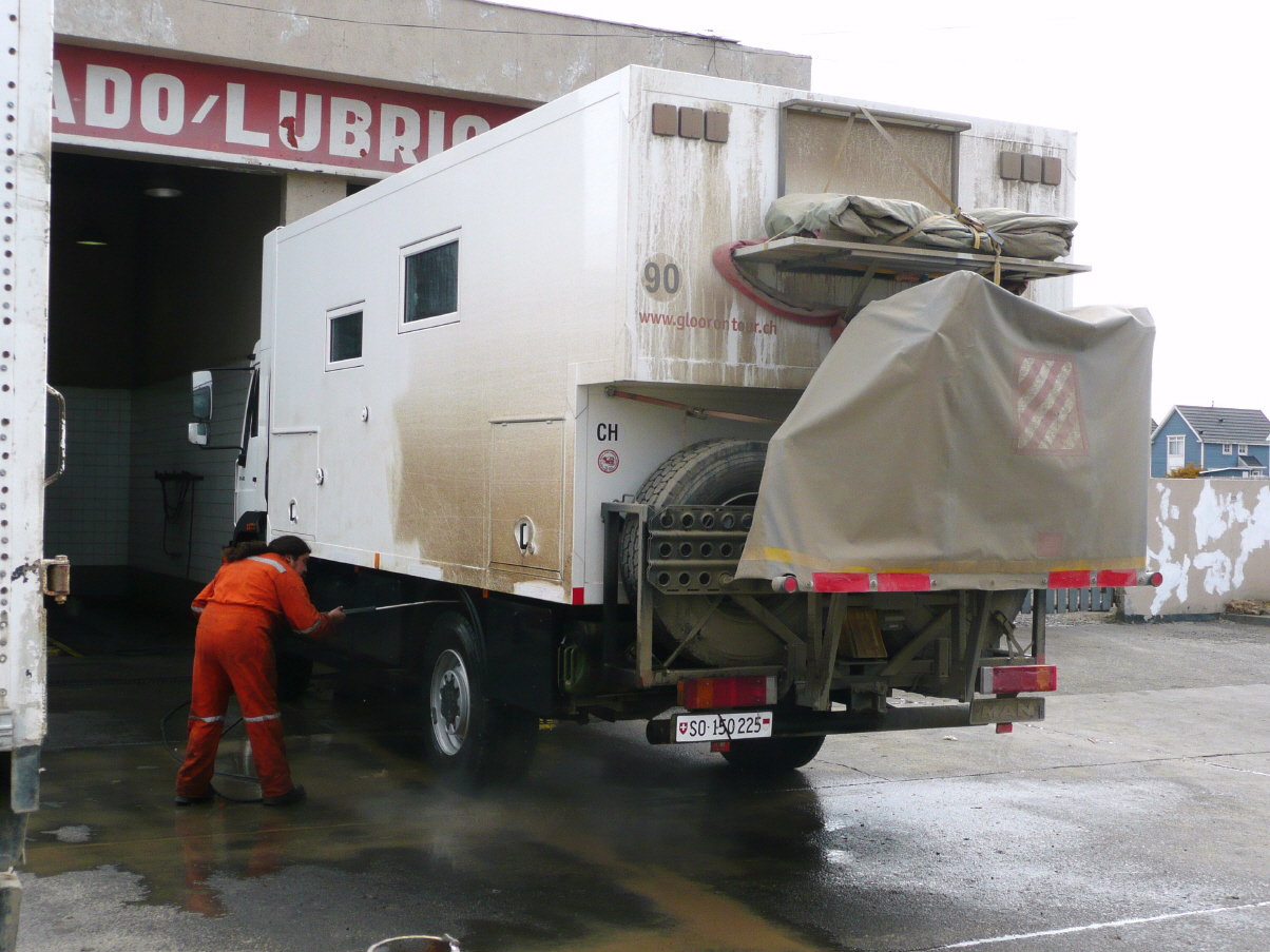 Fahren zum Hafen, denn die Tickets für die Fähre können ab 13.00 Uhr gekauft werden. Essen die ersten chilenischen Empanadas – schmecken nicht so gut wie die Argentinischen – und schon kommt der andere Schweizer MAN mit Thomas und Regula angefahren. Kaufen die Überfahrtstickets zu erstaunlich günstigem Preis – müssen später noch nachzahlen. Die ruhige Überfahrt dauert zweieinhalb Stunden. In Puntas Arenas angekommen müssen wir zuerst unseren Vorrat an Frischprodukten auffüllen – mmmmh, ein frischer Apfel. Überhaupt ist es ein äusserst schöner Supermarkt, viel schöner als in Argentinien. Gleich nebenan gibt es bei der Tankstelle angegliedert eine Auto-Wäscherei, die auch LKWs reinigt. Also nichts wie los, denn der MAN hat eine Wäsche dringend nötig.