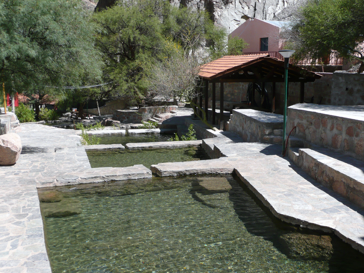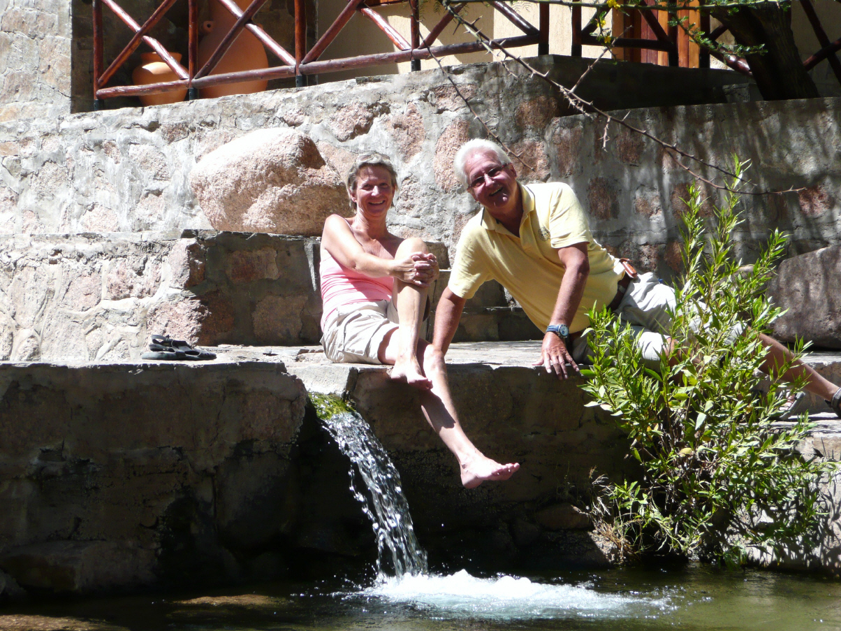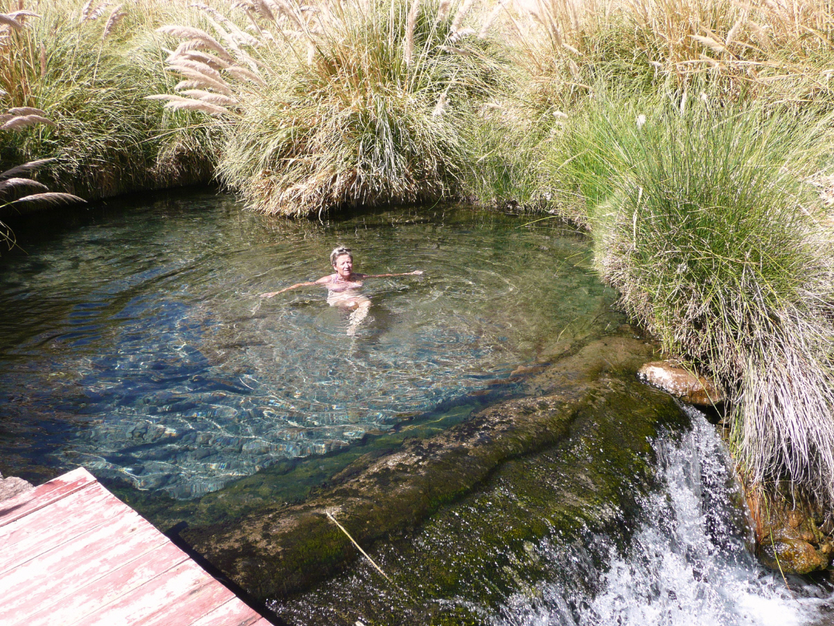 Haben wie die Murmeltiere geschlafen. Laufen die 50 m bergauf bis zum Bassin mit 40 Grad C. Nach 15 Minuten dann hinunter in das Becken mit 30 C. Ein kleiner Mirador lockt für eine kleine Wanderung, denn dort könnte es Handy-Empfang haben, was auch so ist. Die Tessiner, Nicole und Renato, gehen ins Dorf einkaufen und wir bestellen bei ihnen Fleisch, um am morgigen Asado auch mitmachen zu können. Heute gehen wir mit ihnen und Inge und Gerhard ins kleine Restaurant zum Mittagessen. Bei fröhlichen Gesprächen werden Erfahrungen ausgetauscht. Wir legen alle Strassenkarten der diversen Länder auf den Tisch und Renato zeigt uns die besten Routen und gibt gute Ratschläge für Übernachten, Zollabfertigung und vieles mehr. Dies ist alles für unsere nächste Reise sehr interessant. Am Abend sitzen wieder alle im 30-grädigen Becken und schwatzen angeregt, auch mit den Argentiniern. Nachher noch eine Brandy-Runde als Absacker in unserem MAN.