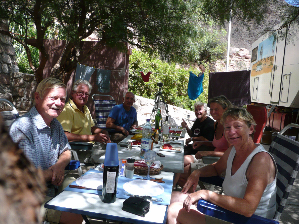 Feines Essen, Wein und einen Pisco. Alle sind in aufgeräumter Stimmung. Kaspar stellt fest, dass sein Pressluftschlauch zum Füllen der Reifen einen falschen Anschlussnippel hat. Ja, man sollte eben vor der Abreise alles auf seine Funktionstüchtigkeit prüfen. Beim Einnachten obligates Bad in der Therme. Es weht ein kräftiger Wind vom Berg herunter. Der MAN wird ein wenig durchgeschüttelt. Sitzen noch gemütlich bei Gerhard und Inge im Camper.
