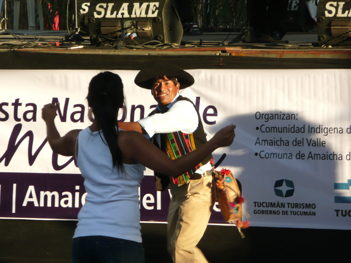 Aufbruch. Inge und Gerhard wollen mit uns bis in die Stadt Fiambala fahren. Vor der Stadt ist ein kleiner Fluss, der zur Zeit ca. 70 cm Wasser führt. Wir mit unserem 4 WD fahren ohne Probleme durch den Fluss. Gerhard getraut sich nicht und sie fahren zu den Thermen zurück. In Fiambala kurzer Einkaufsstopp. Auf dem Dorfplatz kaufen wir bei Frauen Brot, Süssigkeiten und Empanadas. Dann geht es auf die 460 km lange Reise bis nach ‚Amaicha del Valle‘. Hier ist das ‚64. Fiesta Nacional de la Pachamana‘ im Gang. Wir müssen die Durchfahrt durchs Dorf erfragen, denn die Hauptstrassen sind blockiert. Der Camping befindet sich genau unter dem neuen Puchaman Museum. Wir marschieren ins Dorf. Die Volksmusik ist sehr laut. Die Argentinier tanzen. Viele Kitsch- und Souvenirstände sowie Strassenrestaurants sind um den Hauptplatz aufgestellt. Essen hier etwas Kleines, aber wie immer sind wir viel zu früh. Hier wird erst um 21 Uhr gegessen. Auf dem Camping gibt’s zur Überraschung wieder seit langen einmal Internetzugang.