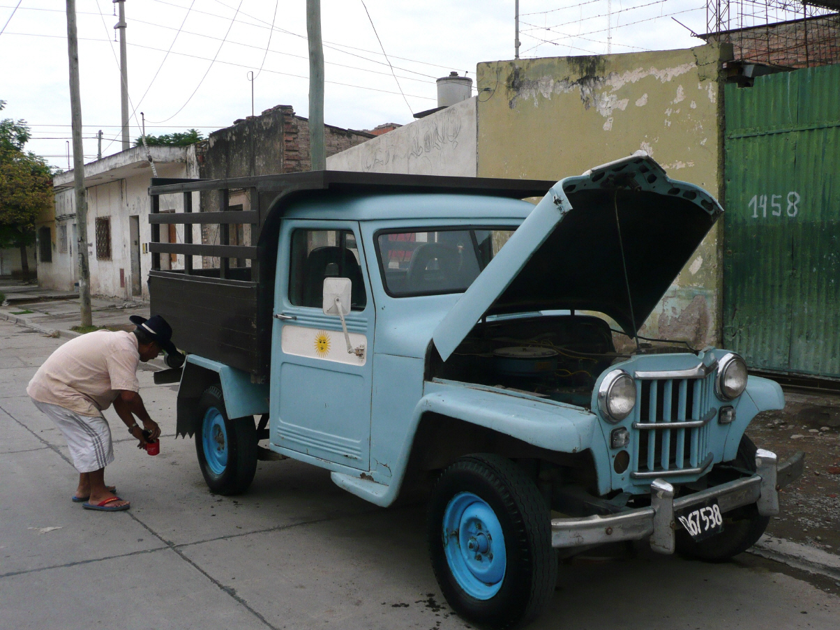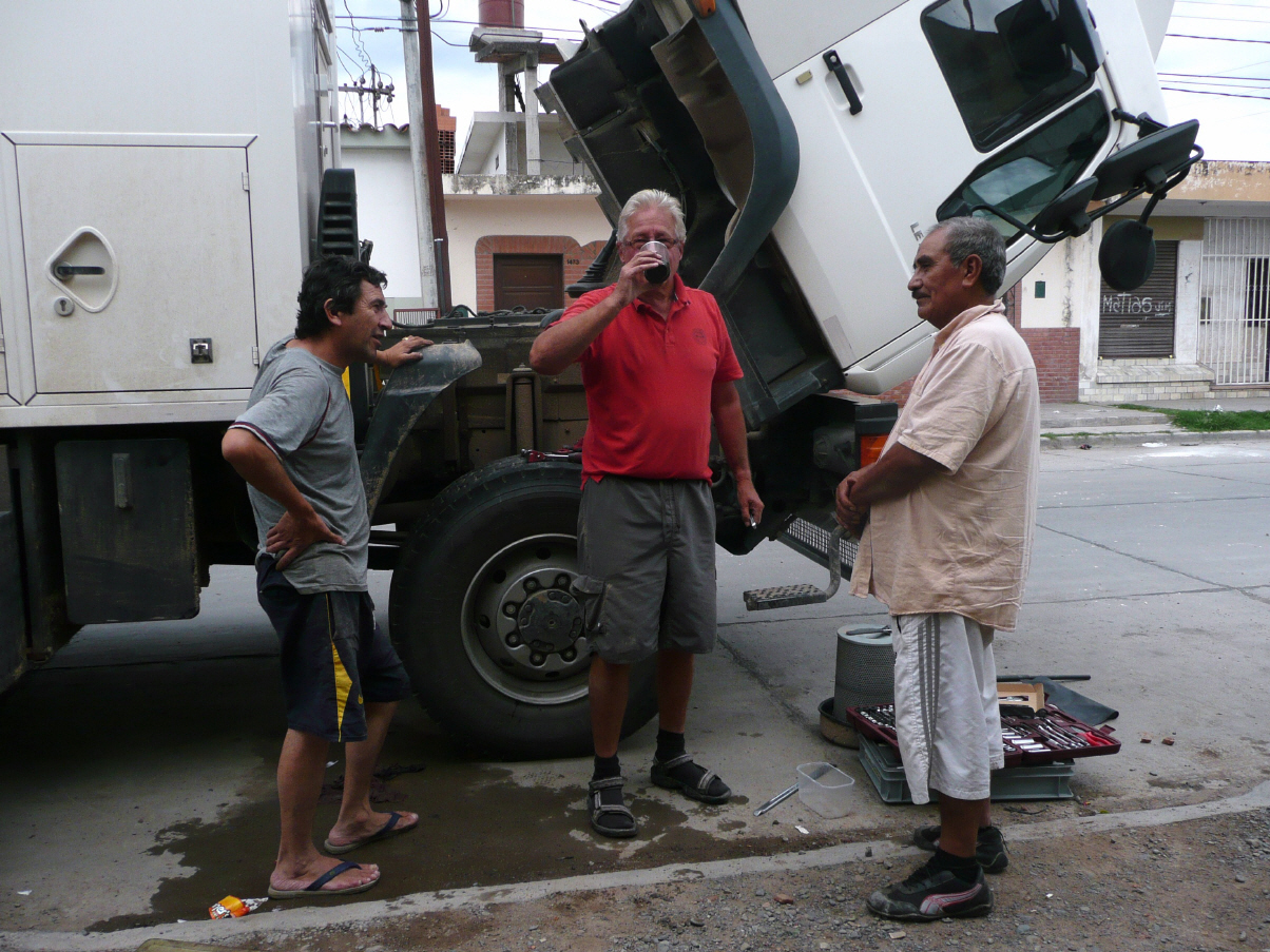 Wäsche zur Rezeption bringen. Dann fahren wir zu der uns empfohlenen Adresse für die Reparatur des MAN. Finden nach einigem Suchen die Werkstatt, aber niemand ist hier. Warten 30 Minuten und fragen nach. Dabei erfahren wir, dass der Besitzer vielleicht um 2 Uhr oder irgendwann zurück sein wird - südamerikanische Mentalität! Weiter zur Tankstelle um den Dieseltank zu füllen. Fragen nach einem Automechaniker. Das Problem ist, dass wegen dem Karneval bis Mittwoch alles geschlossen ist, was zwar übertrieben ist, denn kleinere Werkstätten und Läden haben offen. Der Tankwart holt einen älteren Mann von genau gegenüber. Es stellt sich heraus, dass er der Mechaniker ist. Man sieht es auch an seinem schmutzigen Übergewand. Kaspar erklärt das Problem und er bittet uns in die Nebenstrasse 50 m neben der Tankstelle. Er und sein Sohn kriechen unter den MAN und innert 30 Minuten ist das Bremsproblem behoben (100 Pesos). Inzwischen suchen wir den Metallurgica (Schweisser) einen Block nebenan. Leider ist er gerade weg gefahren.