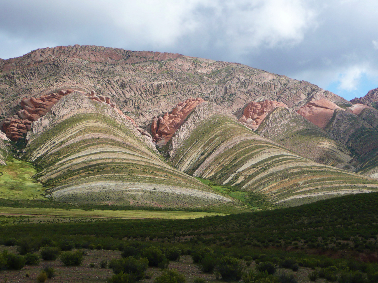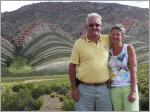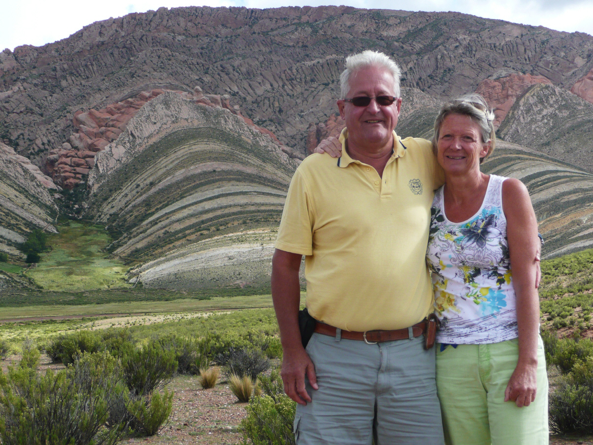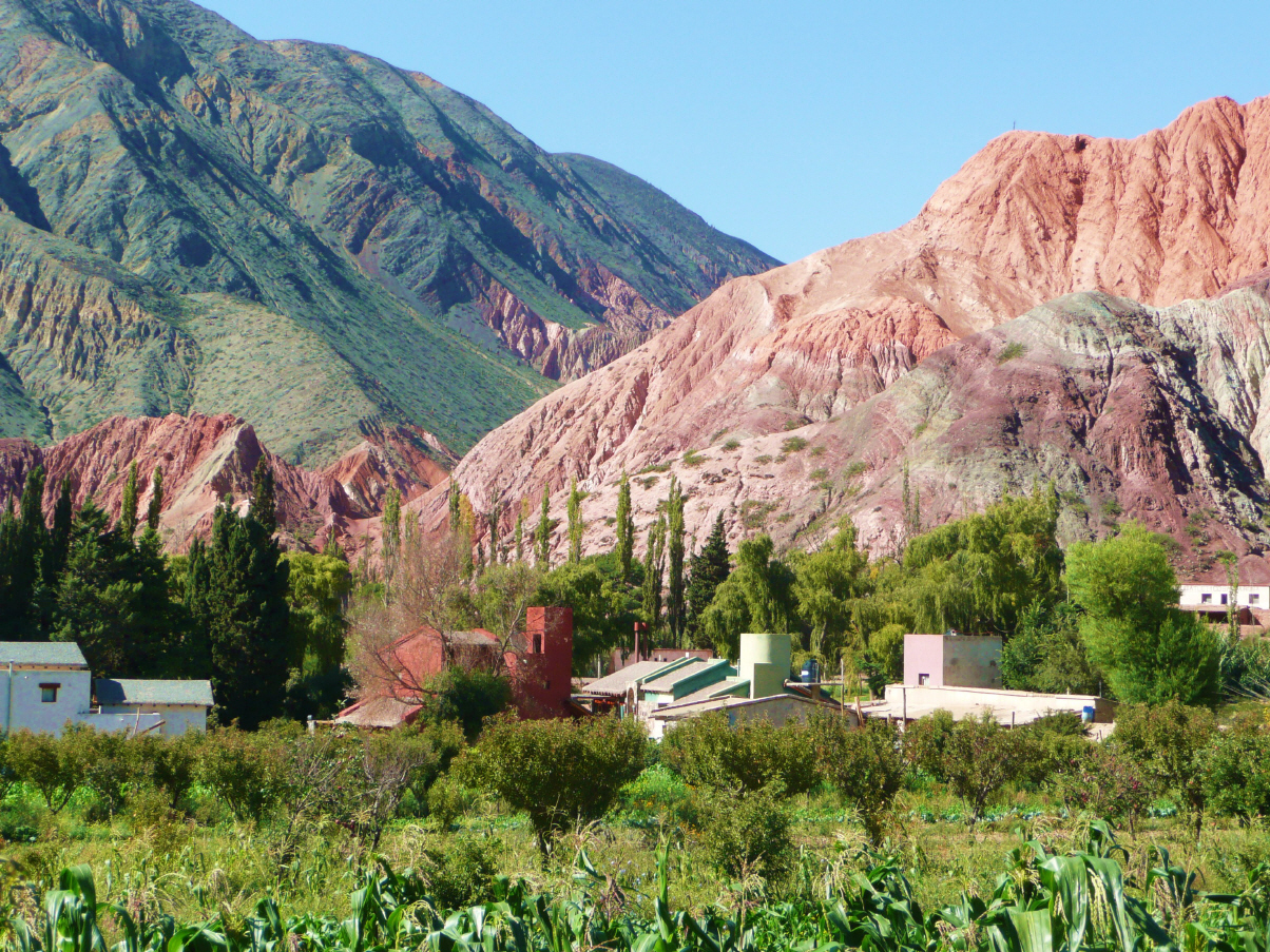 Nach 50 km kommen wir in Purmamarca an. Hier hat die Natur ein vierfarbiges Felsband freigelegt. Rot und braun in allen Schattierungen, grün, violett und gelb. Finden das Hotel, wo Walti, Madelaine und Fridolin logieren. Fragen, ob wir im Hof übernachten können. Die Antwort lautet halb ja, halb nein. So stehen wir nun direkt vor dem Hoteleingang an der Strasse mit wunderschönem Blick auf das farbige Felsband.