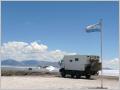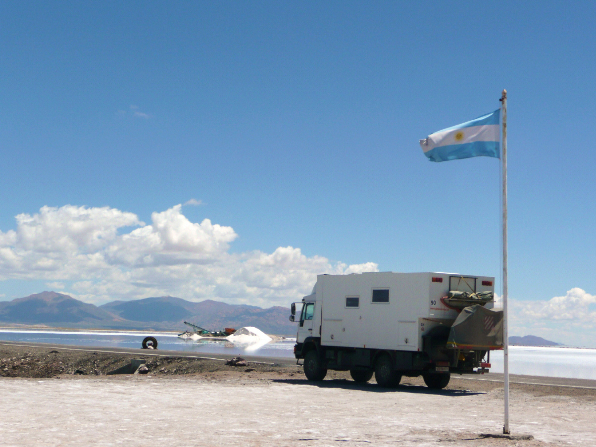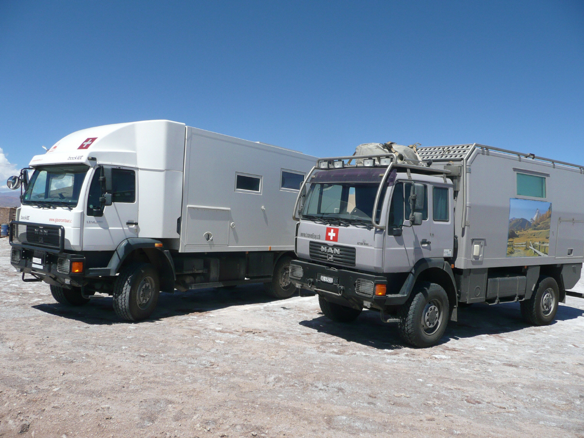 Mit den letzten 1610 Pesos kauft Bigi zwei Mangos. Dies kostet genau 1600 Pesos und Bigi ist grosszügig und schenkt der Gemüsehändlerin die 10 Pesos (2 Rappen). Zollabfertigung hier im Dorf und dann Richtung Passo Sico. Bis Socaire ist asphaltiert, nachher Schotterpiste. Machen einen kurzen Abstecher an die Laguna Miscanti. Hier kostet der Parkeintritt 2500 Pesos pro Person, aber wir haben keinen einzigen Pesos mehr und möchten mit US-Dollar zahlen. Würden etwas mehr geben (11 Dollar), aber die Parkwächterin will einfach nicht. Zum Glück kommt ein chilenischer Reiseführer und kann sie vom Wechselkurs überzeugen und so zahlen wir 12 Dollar. Die zwei Lagunen sind dunkelblau und heben sich von der braunen Umgebung fotogen ab. Parkieren unseren MAN vorwärts auf dem sehr grossen Parkplatz bei der Lagune. Das passt der dort anwesenden Parkwärterin nicht. Auf 3999 m Höhe bittet uns doch tatsächlich die Parkwächterin den MAN um 180 Grad zu wenden. Ausser uns war dort niemand, Amtsschimmel lässt grüssen! An weiteren schönen Salzlagunen entlang noch einmal zum chilenischen Zoll. Hier werden von Hand alle Personen- und Fahrzeugdaten in ein dickes Buch eingetragen. Weiter über eine Hochebene zum argentinischen Zoll. Wir sind die einzigen Reisenden, aber die Abfertigung hier dauert lange. Der Zöllner nimmt es sehr genau. Am Schluss haben wir wieder eine 8-monatige Bewilligung für das Fahrzeug, für uns jedoch nur 3 Monate. Wir dürfen aber ohne Fahrzeug das Land nicht verlassen. Das Problem versuchen wir zu lösen, indem wir nach Uruguay/Montevideo ins Winterquartier ausweichen. Nun den Pass hinunter, aber es geht wieder hinauf auf 4560 m zum Passo Chorillos und erst dann hinunter Richtung Salta. Viele Serpentinen und einigermassen gute Schotterpiste. Verpassen prompt das grosse Eisenbahnviadukt und landen im dreckigen Bergbaudorf San Antonio de los Cobres. Hier parkieren wir auf einem Militärgelände. Fragen einen Offizier, ob wir eine Nacht bleiben dürfen. Wir dürfen. 5 Minuten später kommt ein anderer Offizier mit dem Wachsoldaten und verlangt 100 Pesos. Wir sind so baff, dass wir die 100 Pesos bezahlen. Diese Kaserne ist ja eine richtige ‚Touristenfalle‘. Bigi ärgert sich ein wenig. Sicher wird dieses Geld (CHF 25) für den Kompanieabend gebraucht.