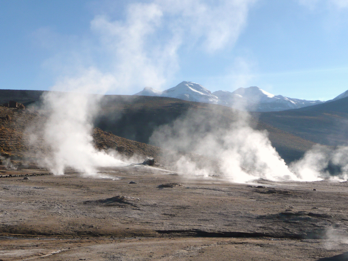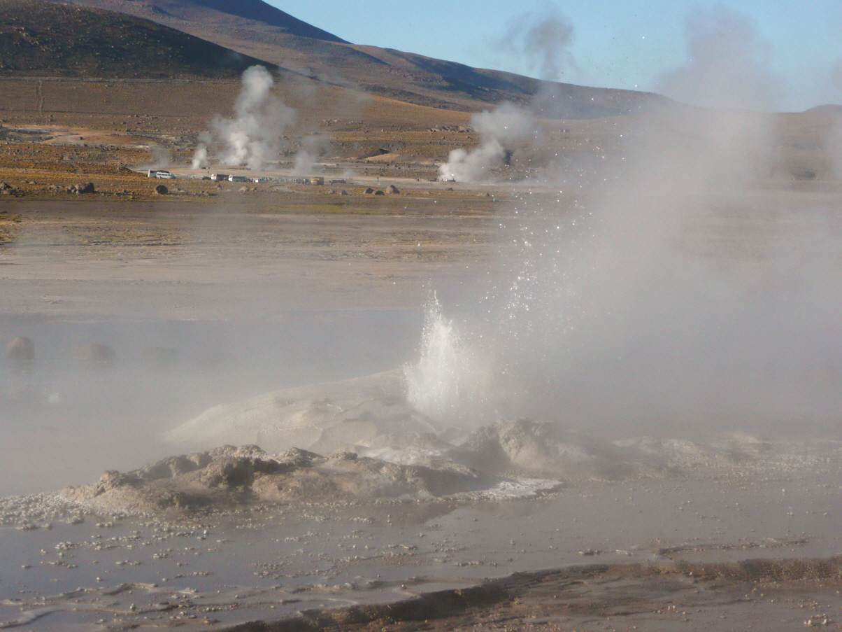 Um 6 Uhr werden wir durch die ankommenden Touristenbusse geweckt. Schlaftrunken wälzen wir uns aus den Federn und genehmigen uns einen Schwarztee. Bei Dunkelheit holpern wir zu den Geysirs El Tatio. Bei Sonnenaufgang erwachen die Geysirs zum Leben. 85ig-grädige Dampffontänen schiessen in die Luft.