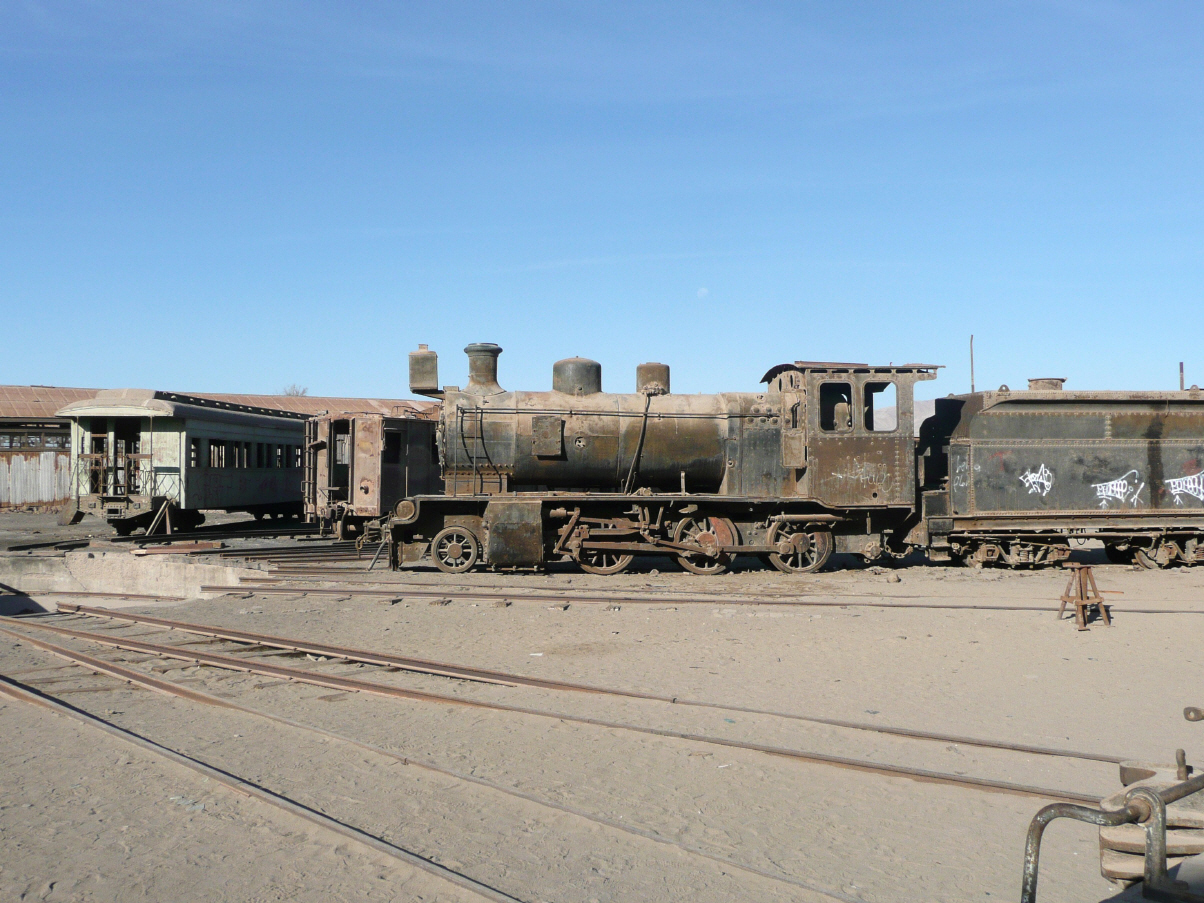 Wir möchten die weltweit grösste Kupfer-Tagbaumine besichtigen. Nachdem wir endlich das Reservationsbüro für die Besichtigungstour gefunden haben, sind wir genau 20 Minuten zu spät für die heutige Tour. Werden es auf dem Rückweg noch einmal versuchen. Fahren Richtung Antofagasta am Pazifik. Besichtigen kurz eine alte verfallene Salpeter-Salzstadt. Grusselig, da keine Leute hier. In Baquedano, wo wir übernachten, soll es ein Eisenbahn-Museum geben. Nach einigem Suchen finden wir eine Remise mit alten, vergammelten Dampfloks. Viele Lastwagen mit riesigen Pneus und Maschinen für die Kupfermine fahren hier durch. Nah dann ruhige Nacht!