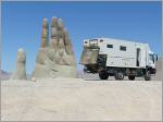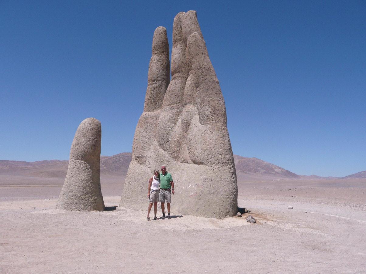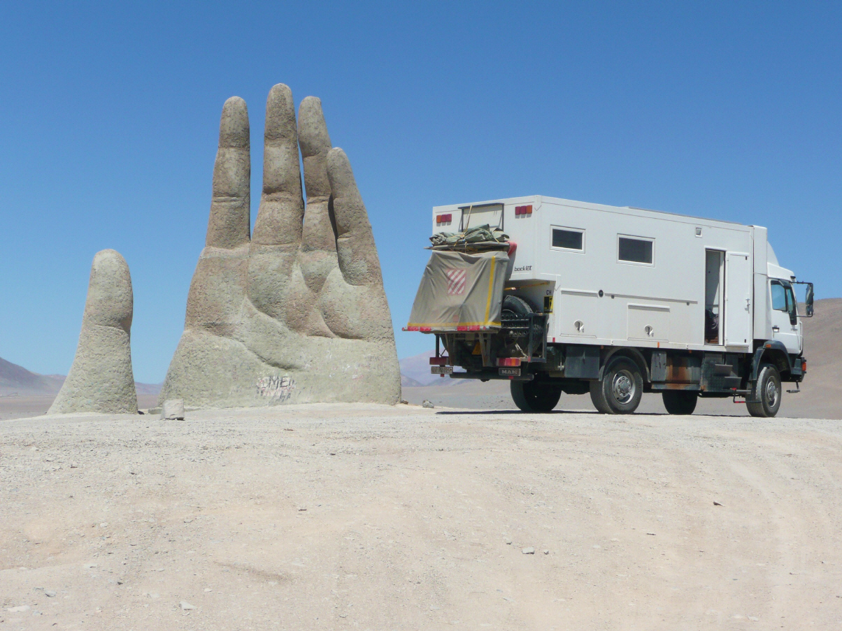 Trotz Strassenlärm konnten wir einigermassen gut schlafen. Nach Antofagasta, einer Stadt mit 290‘000 Einwohnern, sind es 70 km. Suchen und finden die MAN-Garage ‚MACO‘. Besprechen mit einem Angestellten die anstehenden Kleinreparaturen. Verabreden einen Termin für morgen. 70 km südlich Richtung Santiago gibt es eine in der Wüste stehende Skulptur ‚Mano del Desierto‘. Diese Hand steht hier seit 1992 und wurde angefertigt vom Künstler Mario Irarrazaeal. Nun stehen wir etwas ausserhalb von Antofagasta am Strand. Die Brandung ist momentan die einzige Lärmquelle.