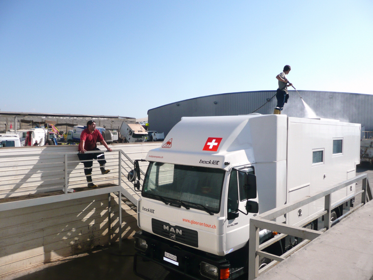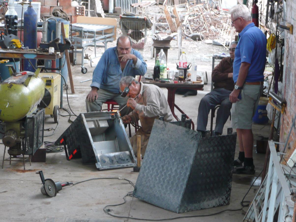 Suchen sofort den Metallurgica auf. Er lacht, als er uns sieht, begutachtet den Schaden und macht sich sofort zusammen mit einem Freund an die schweisstreibende und dreckige Arbeit. Die ganze Treppe inklusive Kasten wird demontiert, gerichtet und geschweisst. Der Zusammenbau gestaltet sich etwas schwieriger, da Kaspar nicht aufgepasst haben beim Demontieren. Am Schluss, nach 4 Stunden, funktioniert fast alles. Nur beim Starten des MAN geht die Treppe anstatt hinein, hinunter. Kaspar in seinem Dusel hat die Elektrik falsch gepolt. Na ja, es ist schon spät und dunkel. Kaspar wird dann morgen auf dem Camping das Problem beheben. Was sehen da unsere müden Augen: der Camping ist übervoll, Zelt an Zelt, laute Musik und Asado mit viel Rauch vom Grill. Wir erfahren dass dieses Wochenende Rockkonzerte im nahen Stadion stattfinden. Na was soll, sind ‚uf de Stümpe‘.