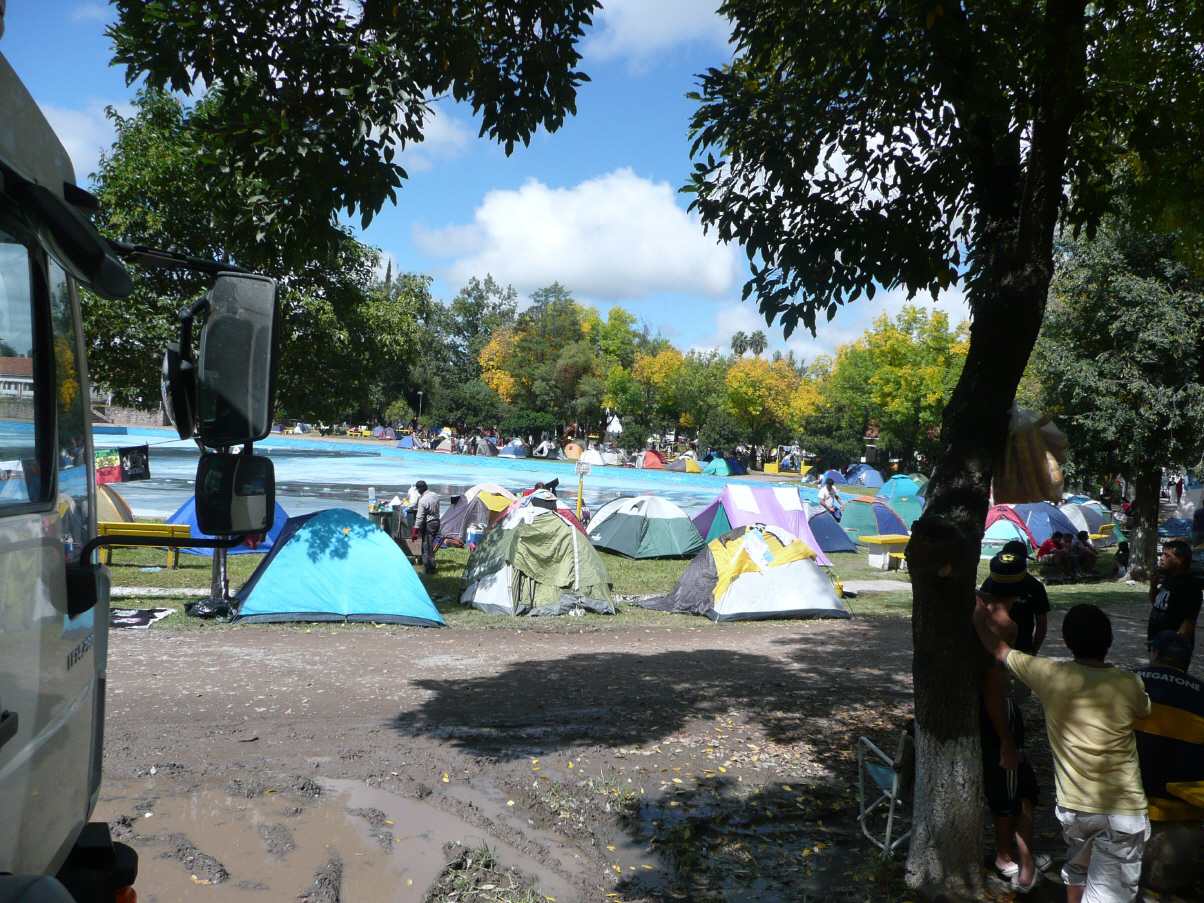 Die Nacht erstaunlich gut überstanden. Kommen noch mit dem französischen Zirkusdirektor und seiner Frau ins Gespräch. Sie sind bereits zwei Monte auf dem Camping, aber das was zur Zeit abgeht, haben sie noch nie erlebt. Mehr als 2000 Leute sind auf dem Camping und es gibt 4 Toiletten. 34 km von Salta entfernt haben sie ein 2500 m2 grosses Grundstück gekauft und wollen dort ein kleines Haus bauen. Für uns Europäer ist so ein Kauf sehr günstig. Unser Espressokaffee schmeckt den Beiden vorzüglich und so wird eben etwas länger geschwatzt. Die Ausfahrt aus dem Camping gestaltet sich mit unserem grossen Fahrzeug etwas schwierig. Bigi versucht die hereinströmenden Autos zu stoppen. Erst als Kaspar einige Fahrzeuge bedrängt, öffnet sich für uns die Ausfahrt.
