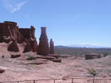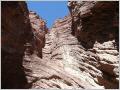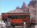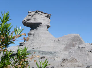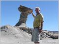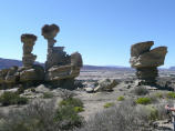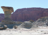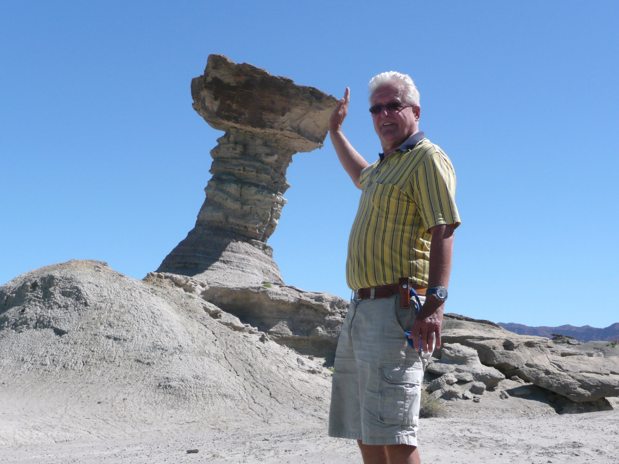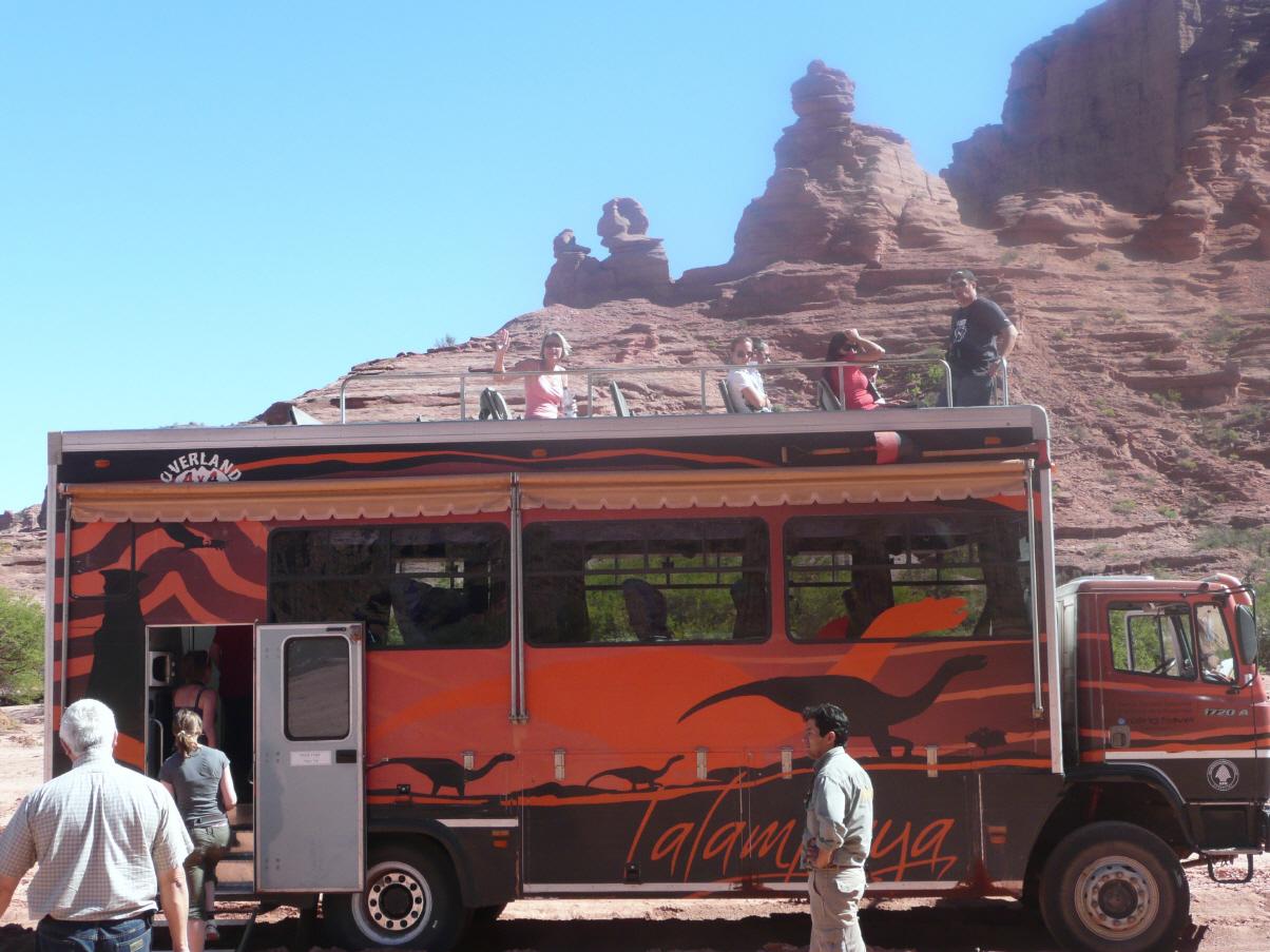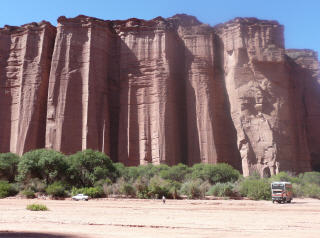 Heute ist Valle de Luna angesagt, Name auf indianisch: ‘Ischigualasto’. Um 9 Uhr geht’s los. Etwas 10 Fahrzeuge fahren im Konvoi ins Valle de Luna und besichtigen die schönen, skurrilen Felsformationen. Boole-Kugeln, farbiges Tal, U-Boot etc. Auf dem Rückweg dürfen wir frei fahren und fotografieren. Und prompt hat ein alter Jeep eines Argentiniers – Bigi sagte noch: sieh mal der schöne, gelbe Jeep – einen Achsbruch. Ein Vorbeikommen an diesem Havaristen ist nicht zu denken. Kaspar will nicht den MAN aus dem Sand schaufeln. Also auf der engen Strasse wenden und auf der gleichen Strasse zurück. Zum Glück ist es eine Rundtour, sonst würden wir heute noch dort stehen. Beim Parkeingang essen wir etwas Kleines, denn heute gas es nur ein knappes Frühstück und inzwischen ist schon 2 Uhr. Fahren die 80 km bis zum Nationalpark Talampaya.