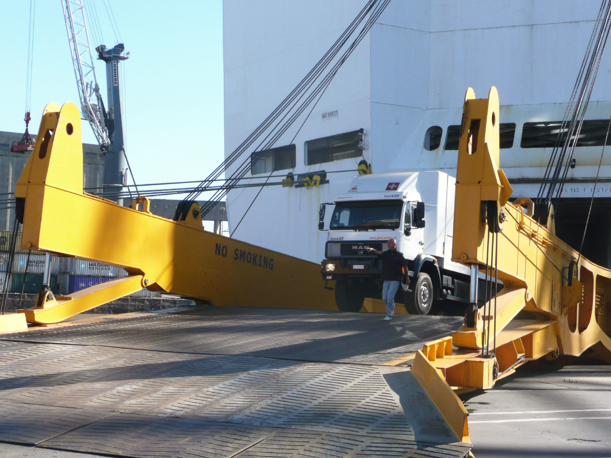 Um 06.00 Uhr schnell unter die Dusche, denn wir können schon die Hafenmauer sehen! Noch kurzes Morgenessen und um 09.00 Uhr fahren wir mit unserem Wohnmobil aus dem Schiff auf südamerikanischen Boden! Bei uns wurde die Einfuhrbewilligung für den Roller vergessen und der Zollbeamte muss dies nachholen. Zum Glück haben wir dies bemerkt, sonst hätten wir irgendwann grosse Zollschwierigkeiten bekommen. Nach einer Stunde warten können auch wir das Hafengelände verlassen. Vor dem Zoll verabschieden wir die anderen Mitreisenden. Vermutlich werden wir uns auf dem Weg nach Süden irgendwo mal wieder treffen. Fahren zum alten Hafen, einem neuen Nobelquartier, welches von der Polizei rund um die Uhr bewacht wird. Finden dort in einer Seitenstrasse zusammen mit Thomas und Heidy einen ruhigen Parkplatz.