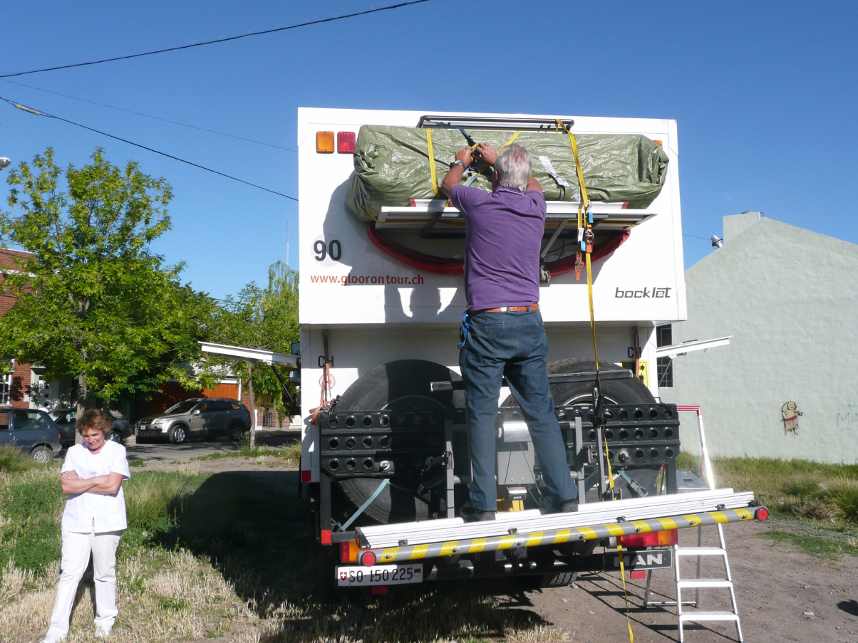 Zurück beim MAN klebt Kaspar die reflektierenden Bänder. Es braucht seine Zeit. Am Abend treffen wir Peter und Hedi aus Feldbrunnen, welche uns in ein gutes Restaurant zum Asado einladen. Lassen uns ein riesiges Lombo (350 g Rindsfilet) schmecken. Natürlich hat Kaspar in der Nacht dann Probleme.