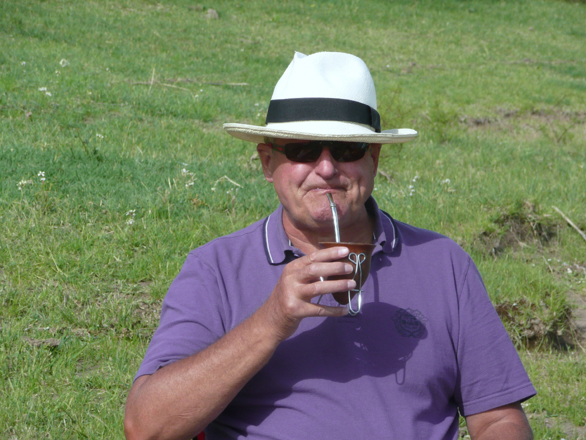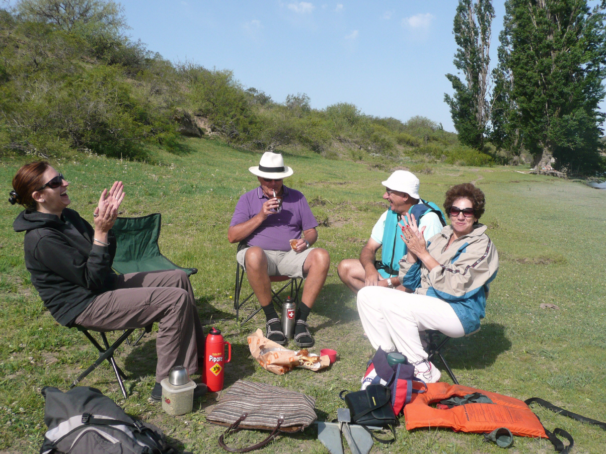 Am Nachmittag unternehmen wir nun die Speed Boat Fahrt auf dem Rio Negro. Das Speed Boat stellt sich als kleines, altes Sportboot heraus, aber es fährt grossartig. Um das Boot zu wassern muss zuerst die Flut kommen. In Viedma (30 km vom Atlantik entfernt) beträgt der Unterschied von Ebbe und Flut immerhin ca. 10 m. Fahren den Fluss hoch, bewundern die Kapriolen eines Seehundes, machen Pause und Kaspar trinkt das erste Mal Mate. Sein Gesichtsausdruck sagt alles, schmeckt ihm nicht besonders. Zum Mate wird Süssgebäck gereicht und geschwatzt. Zurück zum Jachthafen, wo wir uns verabschieden. Sind bereits die besten Freunde geworden und wir werden zum Abschied geknutscht. Inzwischen hat Monica Kaspars Blutwerte abgeholt: alles bestens! Am Abend laden wir Monica und Eduardo ins ein neues, schönes Restaurant am Fluss ein.