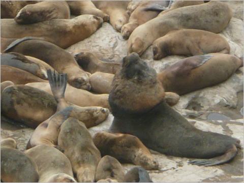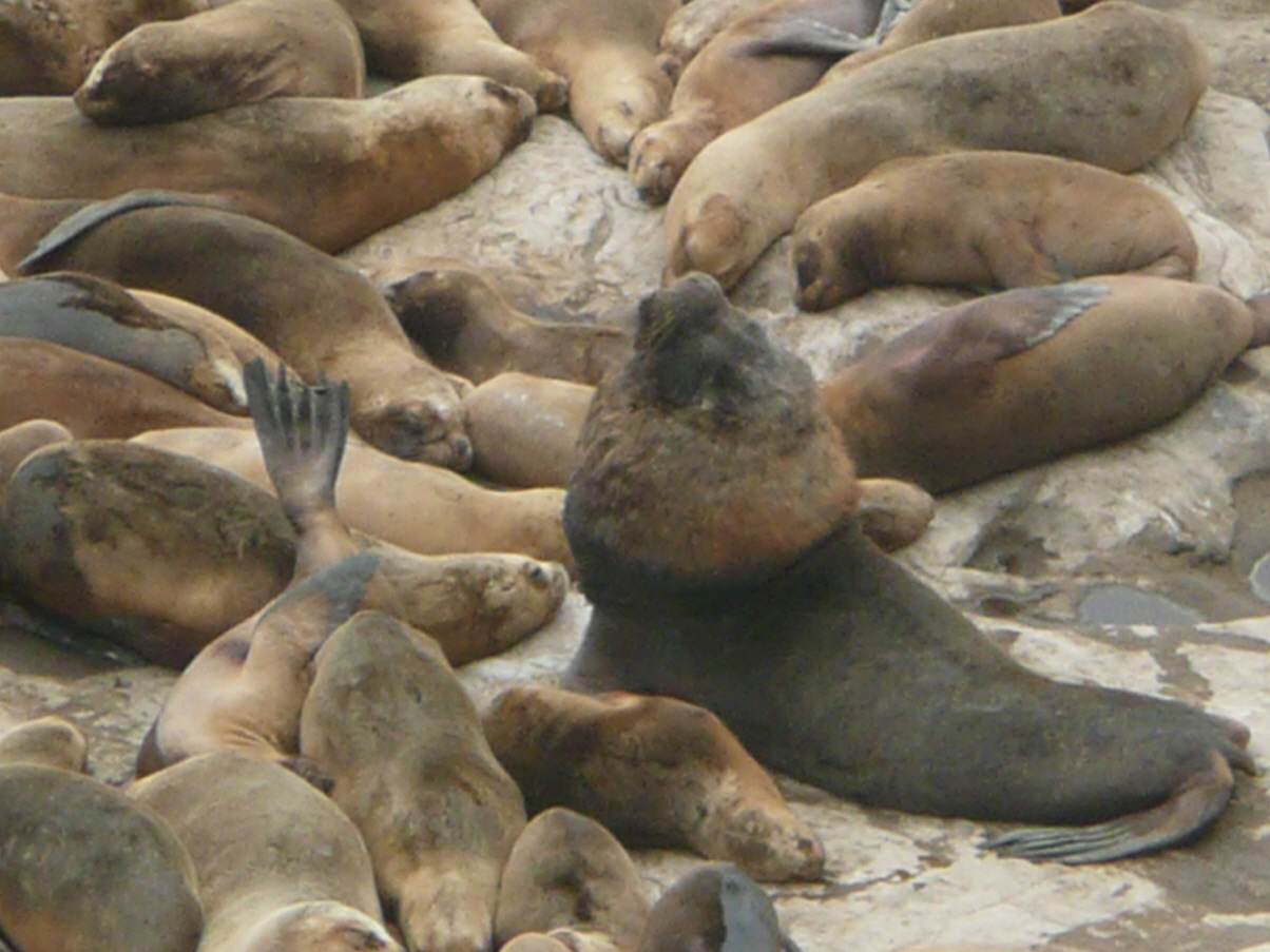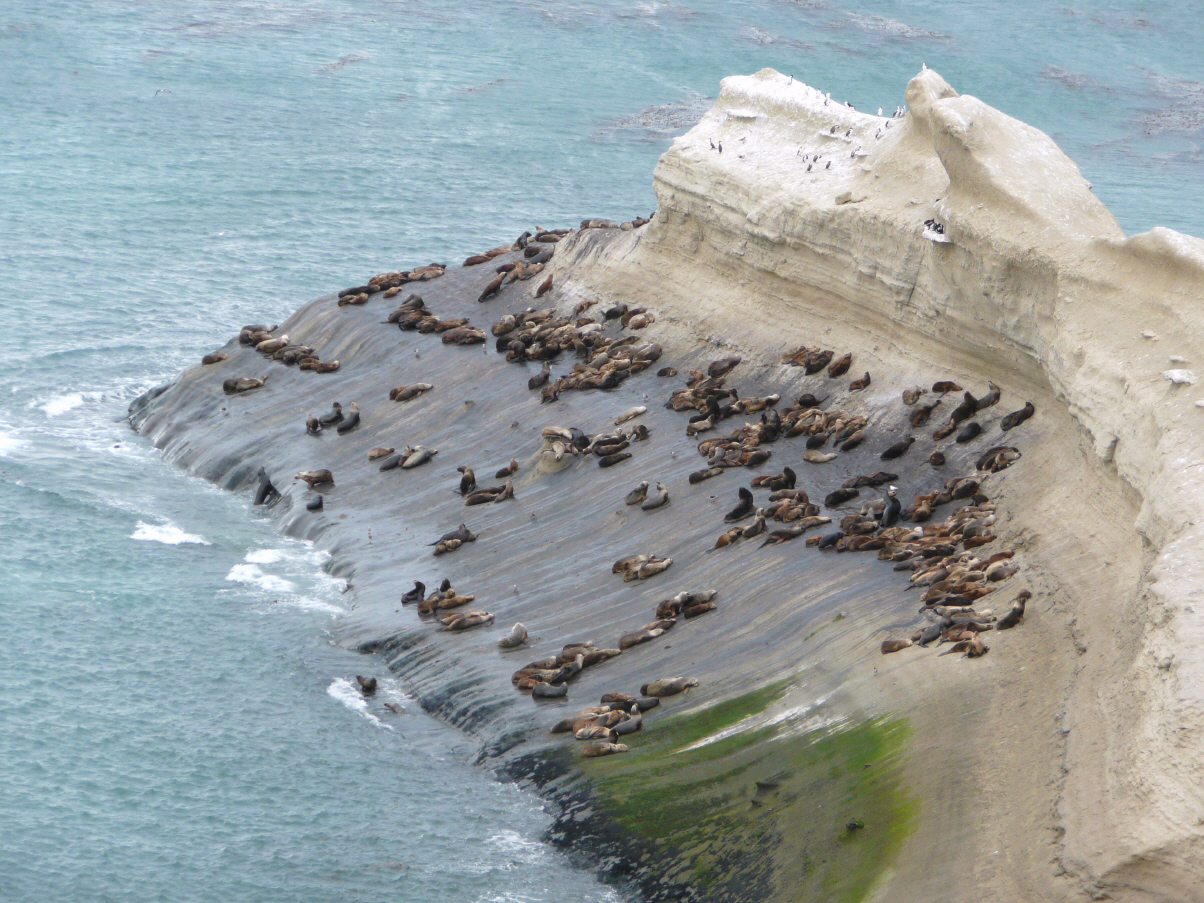 Die faulen Säcke bewegen sich kaum, denn sie sind keine Frühaufsteher und nur ab und zu robbt mal einer ins Wasser. Fahren der Küste entlang zum Punto Cantor und Faro Punto Delegado. Auf der Fahrt sehen wir viele Hasen, Lamas, Schafe, Pferde, Geckos, Mäuse, paar schöne rote Vögel und auch ein Touristenbus.