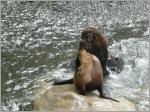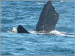 Vor unserer Haustür tummelt sich ein weisses Weibchen und ein schwarzes Männchen. Die Beiden lassen sich gut fotografieren. Das Weibchen kommt bis ca. 20 m an den Strand. Das Männchen ist ca. 16 m lang und ca. 40 Tonnen schwer. Schauen dem Paarungstanz etwa drei Stunden zu. Heute ist Ruhetag. Bigi wäscht ihre schönen T-Shirt von Hand und Kaspar sucht ein Leck in der Wasserleitung. Die Wasserpumpe schalltet alle 2 Stunden einmal ein. Vermutlich war der Hahn für die Aussendusche nicht richtig geschlossen. Am Mittag kurze Wanderung. Sehr anstrengend, da der Strand aus Kieselsteinen besteht und ein starker Gegenwind bläst. Treffen ein junges Schweizer Pärchen, welches die gleiche Strecke fährt wie wir. Trinken zusammen Kaffee und schwatzen. Fabio ist Schweizermeister im Fallschirmspringen. Haben ziemlich Duselgehabt, Wale zu sehen. Immer wieder halten Touristen an und schauen ohne Erfolg aufs Meer raus!