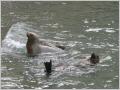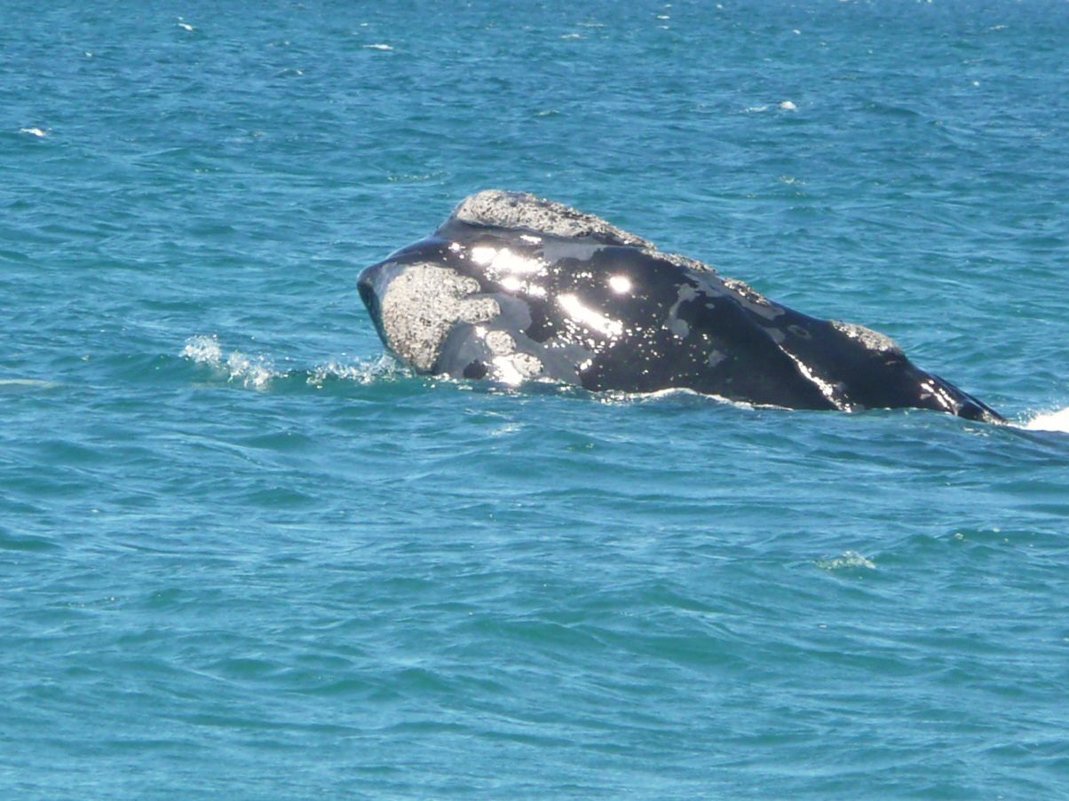 Hier ist wieder eine Strassensperre. Die Polizisten fragen nach Früchten, Fleisch etc. - wir werden durch gewunken. Hinter uns wird ein Bus mit Hunden inspiziert. In Puerto Madryn kaufen wir Lebensmittel ein, denn von nun an dürfen wir bis zur chilenischen Grenze Früchte, Fleisch etc. wieder mitführen. Stehen direkt am Meer vor der ‚Peninsula Valdes‘. Man glaubt es kaum, vom Ufer aus in ca. 30 m Entfernung kann man den Walen ‚Ballena Franca Austral‘ bei der Paarung zuschauen. So nah kommt man nicht einmal mit dem Schiff.