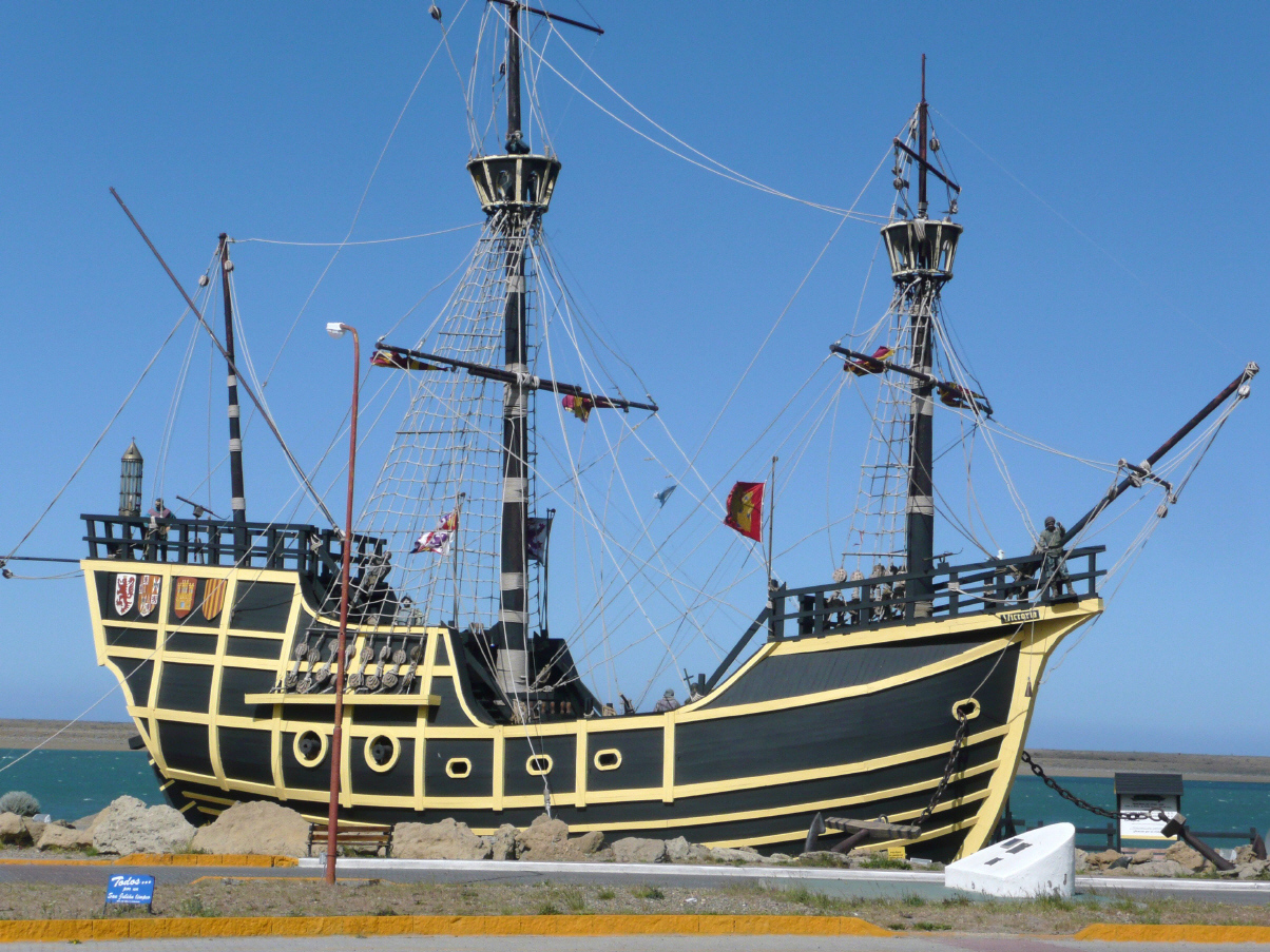 Hier steht das Replikat-Schiff ‚Nao Victoria‘ des Entdeckers der Magellanstrasse im Jahr 1520. Mit 4 Schiffen und 240 Mann fuhren die Entdecker ab, heim kam noch dieses Schiff mit lediglich 18 Mann. Hier blieben sie 5 Monate zum Überwintern. Am Palsonntag 1. April 1520 hat hier einer der Schiff-Geistlichen die erste Messe in Südamerika gelesen. Die Stadt erhofft sich zur 500-Jahrfeier im Jahre 2020 den Besuch des Papstes. Im siebzehnten Jahrhundert kam der Seeräuber ‚Sir Francis Drake‘ hier vorbei. Es gab noch einmal eine Meuterei und ein Kapitän wurde aufgehängt. Wir besuchen die ‚Nao Victoria‘. Hier waren heute vielleicht 8 Touristen und für diese gibt es eine Kassiererin und einen Tourguide mit schlechtem Englisch. Die Öffnungszeiten: 8 - 22 Uhr! Das Gleiche gilt für das Touristenbüro in der Hauptallee. Hier haben heute 4 Personen Auskünfte eingeholt. Prospektmaterial gibt es in Hülle und Fülle, überall andere Prospekte und alle auf Hochglanzpapier – jeder Tourist fühlt sich als VIP behandelt! Bummeln die ‚breite Einkaufsstrasse‘ herauf und nun ist der Ort halt nur noch ein ‚Kaff‘. 5000 Einwohner, ein paar Restaurant (die meisten geschlossen), 4 Hotels, 2 Tankstellen, Postbüro, Supermarkt und ein paar kleine Läden. An einer Strassenecke steht ein Afrikaner und bietet seine Ware feil – wie es ihn wohl hierher verschlagen hat und ob das Geschäft ohne Leute funktioniert?! Es gibt keinen Ort ‚zum Käfele‘ bei diesem Sauwind und so kaufen wir in einer Bäckerei wieder einmal ein paar Guetzli. Warten bis es 20.30 Uhr, damit wir zum Nachtessen in das uns empfohlene Restaurant am Meer gehen können. Kings Krabben und Rindsfilet. Heute hat Bigi ihren Mate im Auto versehentlich umgestossen und Kaspars Aufschrei: ‚die Scheissgülle!‘ Das Heu lag nur so herum.