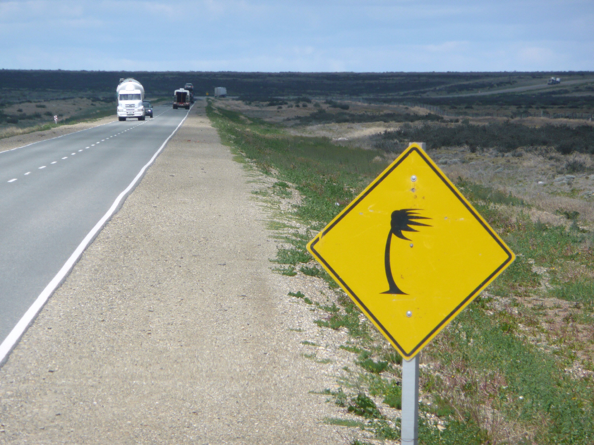 Die harte Bigi macht in der Morgenkälte ihren Morgenspaziergang und Kaspar macht an der Wärme das Frühstück. Dann Richtung Rio Gallegos. Auf ca. 100 km gerader Strasse begegnen uns 53 Autos/LKWs, 3 Motorräder und zwei Mann in ihren Trax, welche die Strassenränder in Ordnung stellen. Zudem haben uns 5 Fahrzeuge überholt. Das Fahren ist eintönig: alles geradeaus, aber man muss gut aufpassen, weil der Wind einem immer aus der Fahrspur drücken will. In Rio Gallegos angekommen kleiner Einkauf bei Carrefour – wir dürfen keine Frischprodukte, Gemüse, Früchte und Fleisch mit nach Chile einführen – also kaufen wir nur Wasser, Mineral, Wein und den uns vor ein paar Tagen vom Produzenten empfohlenen 4-jährigen argentinischen Whisky mit den drei Bullen auf der Etikette. Anschliessend rekognoszieren wir die Stadt. Finden an der Flussmündung eine ruhige Strasse zum Übernachten. Von hieraus fahren wir zu einer Ford-LKW-Garage um unser vorderes Abblendlicht zu reparieren. Es dauert etwa 1,5 Stunden, da der Fordhändler die spezielle H4-Birne zuerst besorgen muss. Rechnung ca. 72 Peso (CHF 18.-).