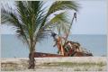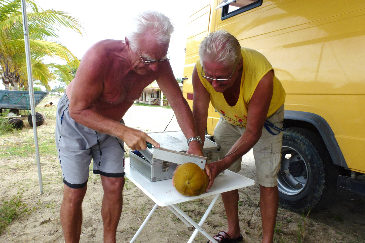 Mit dem Dreirad-Taxi ins Dorf zum Restaurant ‚Challe‘. Vorher kaufen wir noch ein Joghurt und ein paar Tomaten ein. Die Ananas sind schon verfault. Käse gibt es auch nicht. Hier gibt es nur kleine Läden und Gemüse wird in Privathäusern verkauft. Man muss wissen wo! Die Wohnbedingungen sind schrecklich, aber überall läuft der Fernseher. Ebenfalls gibt es einen Kühlschrank im ‚Haus‘. Im Restaurant bestellen wir Fischgerichte. Es kommen riesige Portionen auf den Tisch. Schmeckt ganz gut. Am Schluss dann, etwas was man nicht machen sollte: ein Nestlé-Glacé vom Glacéwagen am Strand. Hundertmal aufgetaut und wieder eingefroren! Beim Camping machen wir noch einen Spaziergang am Strand. Beobachten die roten, schnellen Krebse, welche sofort in ein Loch verschwinden, wenn sie die Erschütterung spüren. Wir sitzen noch zusammen mit Monika und Wolfang und trinken ein Glas Wein bei herrlicher Abendstimmung und relativ wenig Mücken. Kaspar verschwindet bald und legt sich ins Bett.