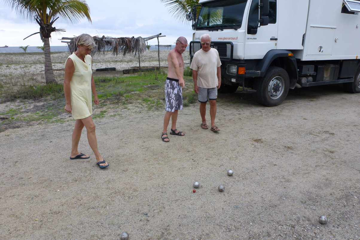 Kaspar ist wieder gesund und wagt ein Bad im Meer. Beim Feriencamp der peruanischen Armee gleich nebenan ist ein Fest mit lauter Musik im Gang. Den ganzen Tag bum-bum?! Wir schauen nach. Es sind verschiedene Militärkompanien mit Kind und Kegel hier und veranstalten sportliche Wettkämpfe. Das könnte wieder einmal eine laute Nacht werden. Unsere Freunde haben Fisch direkt beim Fischer eingekauft. Der Campingbesitzer bereitet diese für uns zu. Kaspar verzichtet freiwillig. Wir drei Camper-Ehepaare spielen Boule, mixen Caipirinha und geniessen einfach den Tag. Heute beginnt es schon um vier Uhr nachmittags leicht zu regnen - immer noch besser als die frostige Kälte in Europa!