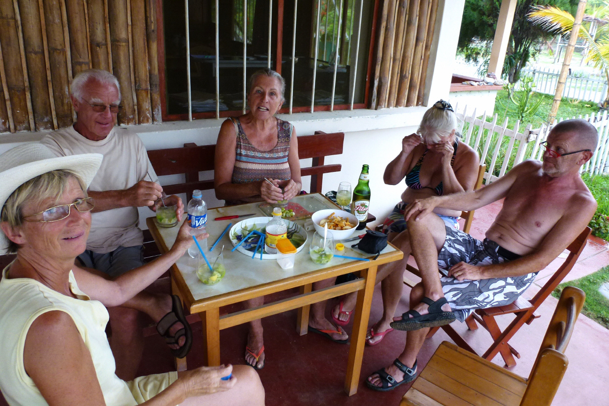 Kaspar plagen die ganze Nacht Magenkrämpfe und er geht öfters mit dem Becken ins Bad. An Tiefschlaf ist nicht zu denken! Das kleine Frühstück bekommt Kaspar nicht und er legt sich gleich wieder hin. Wolfgang (der Veterinär) hat ein Naturheilmittel und gibt Kaspar 30 Tropfen. Und siehe da, es hilft. Nach einer Stunde geht es Kaspar schon besser! Kaspar ist den ganzen Tag schlapp, aber die Lebensgeister kommen zurück und gegen Abend machen wir sogar einen ganz kleinen Strandspaziergang. Bigi, die Krankenschwester kocht ein leichtes Essen. In der Zwischenzeit sind Lucette und Dirk angekommen. Sie wollten eigentlich Richtung Amazonas, aber alle Strassen waren überschwemmt. Auf die Galapagos Inseln fliegen wir definitiv erst von Quito aus.