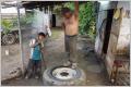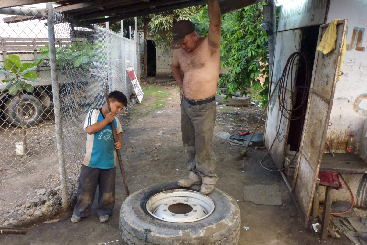 Die MAN-Leute sind so nett und bringen uns zu einem Vulkanisierer. In einem dreckigen Hinterhof wird der Reifen innert 50 Minuten demontiert und repariert. Wir denken, dies war schneller als in der Schweiz mit Maschinen. Kosten US$ 10!.Fahren zurück zu MAN und übernachten nochmals hier. Unterwegs merken wir, dass die Klimaanlage mit warmem Motor heizt, super! Kaum unter dem Dach, fängt es wieder sintflutartig an zu regnen. Wenn das kein Timing war! Beim Schliessen einer Aussenklappe hat sich Kaspar soeben eine riesige ’Schramme‘ an der Stirn zugefügt und es blutet stark. Wir sind ‚nudelfertig‘!